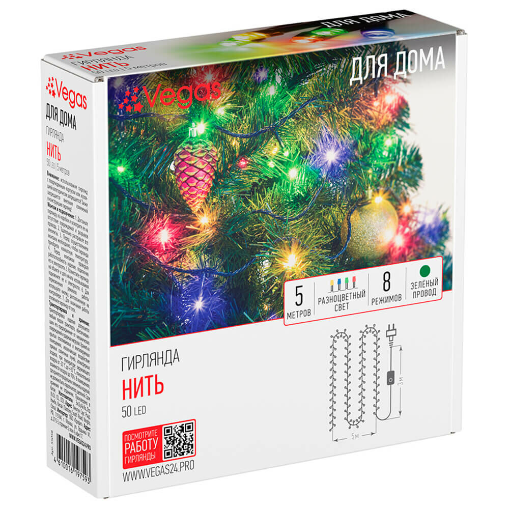 Купить Гирлянда Vegas "Нить", 5м, 50 светодиодов, 8 режимов работы, IP20, зелёный провод