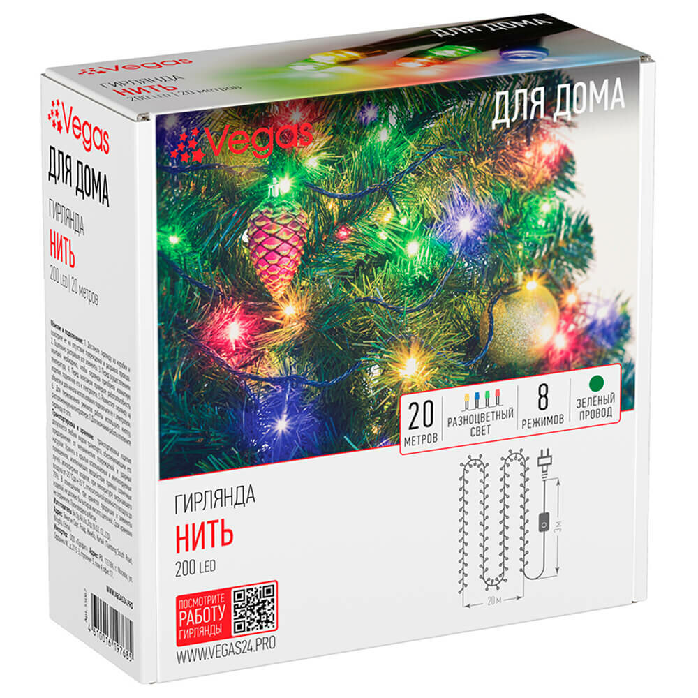 Купить VEGAS Электрогирлянда "Нить" 200 разноцветных LED ламп, контроллер 8 режимов, зеленый провод, 20 м, 220 v /20