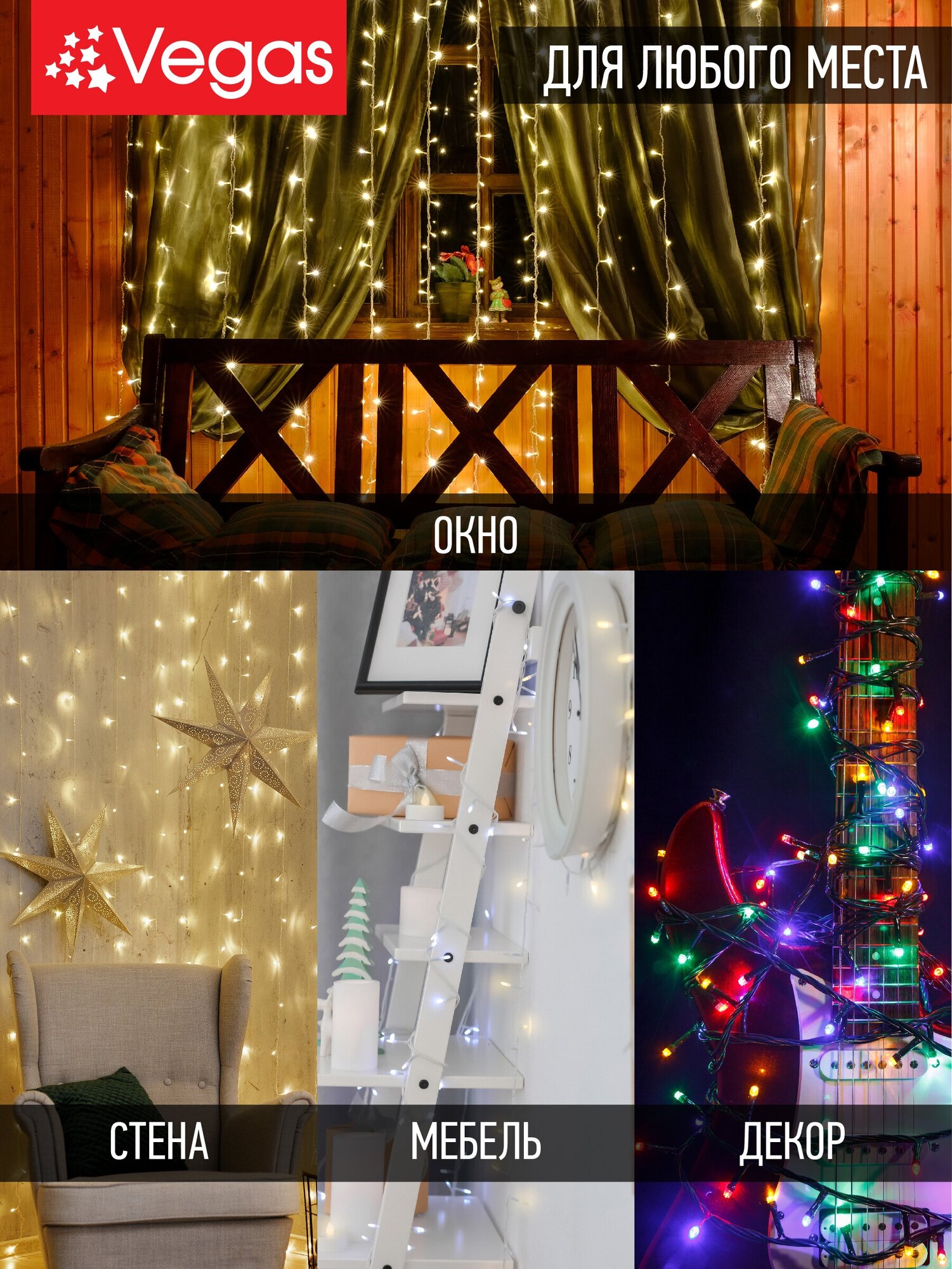 Гирлянда Vegas "Нить", LED, 300 лампочек, 30м, 6Вт, 8режимов, разноцветная, зеленая