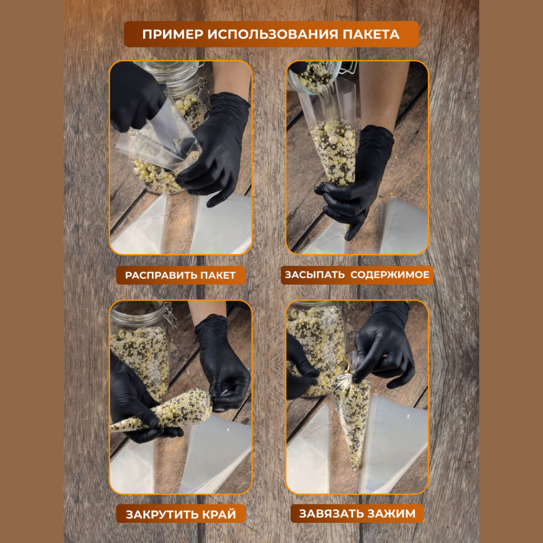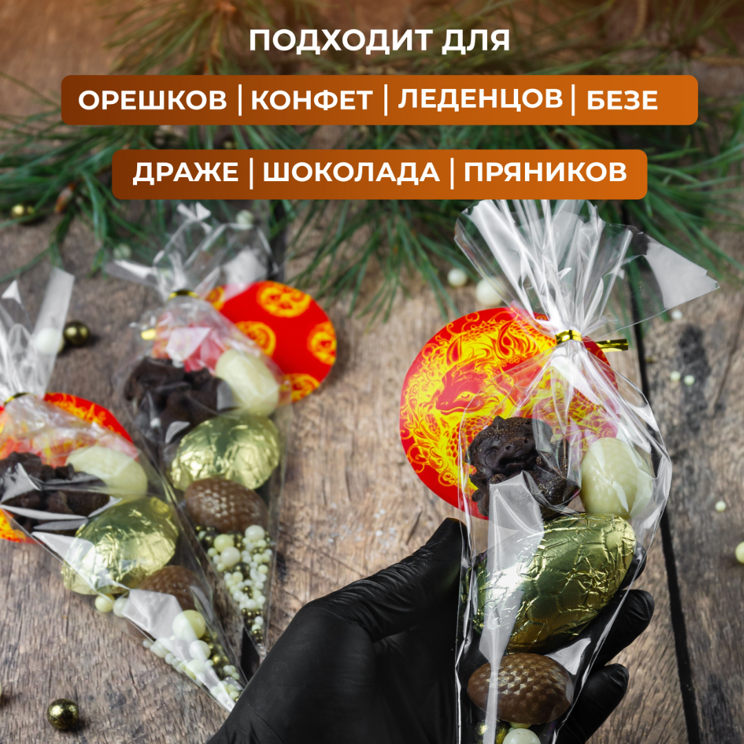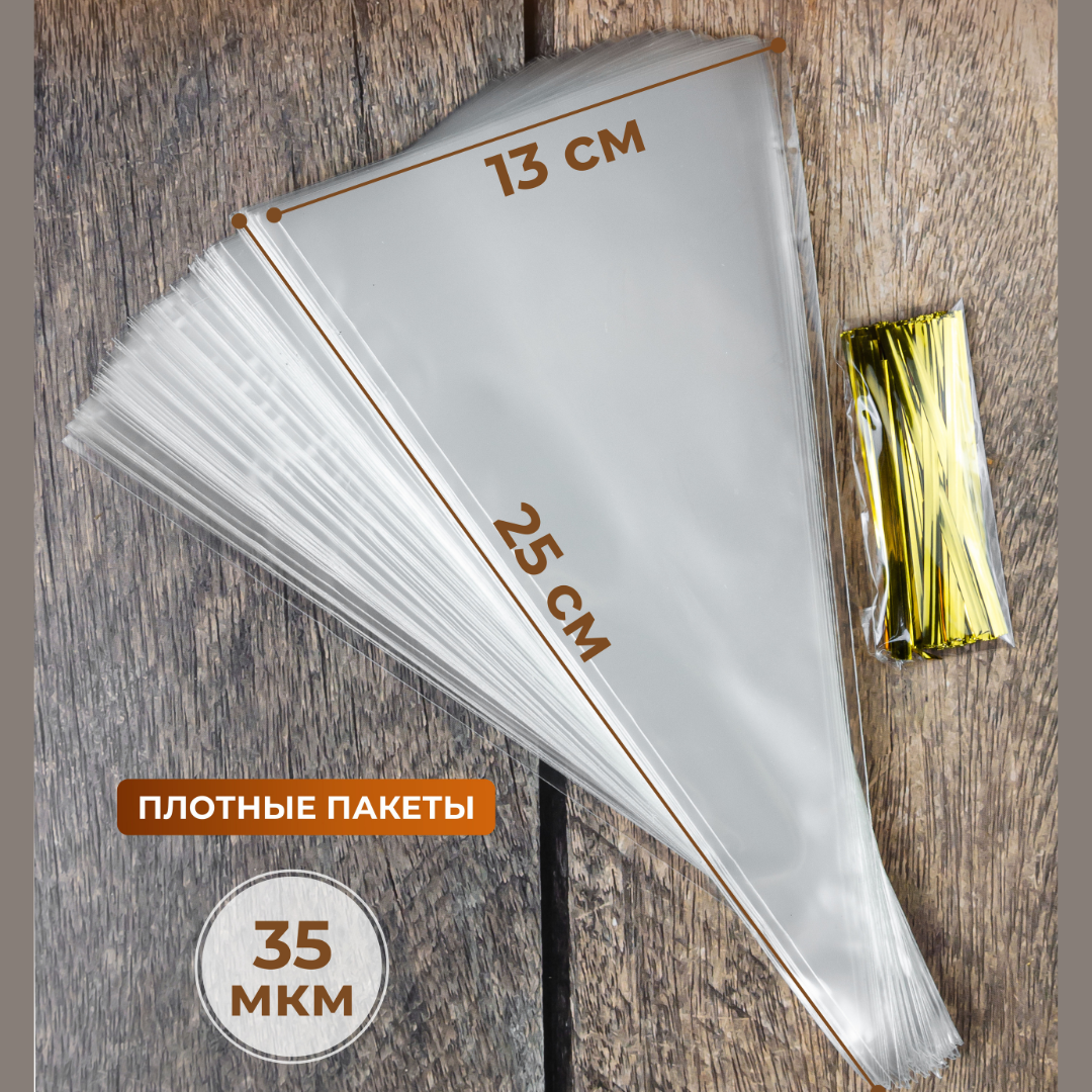 Купить Подарочный пакет - конус треугольный, прозрачный 50 шт. (для упаковки сладостей, орехов, пряников), зажимы для пакетов в комплекте