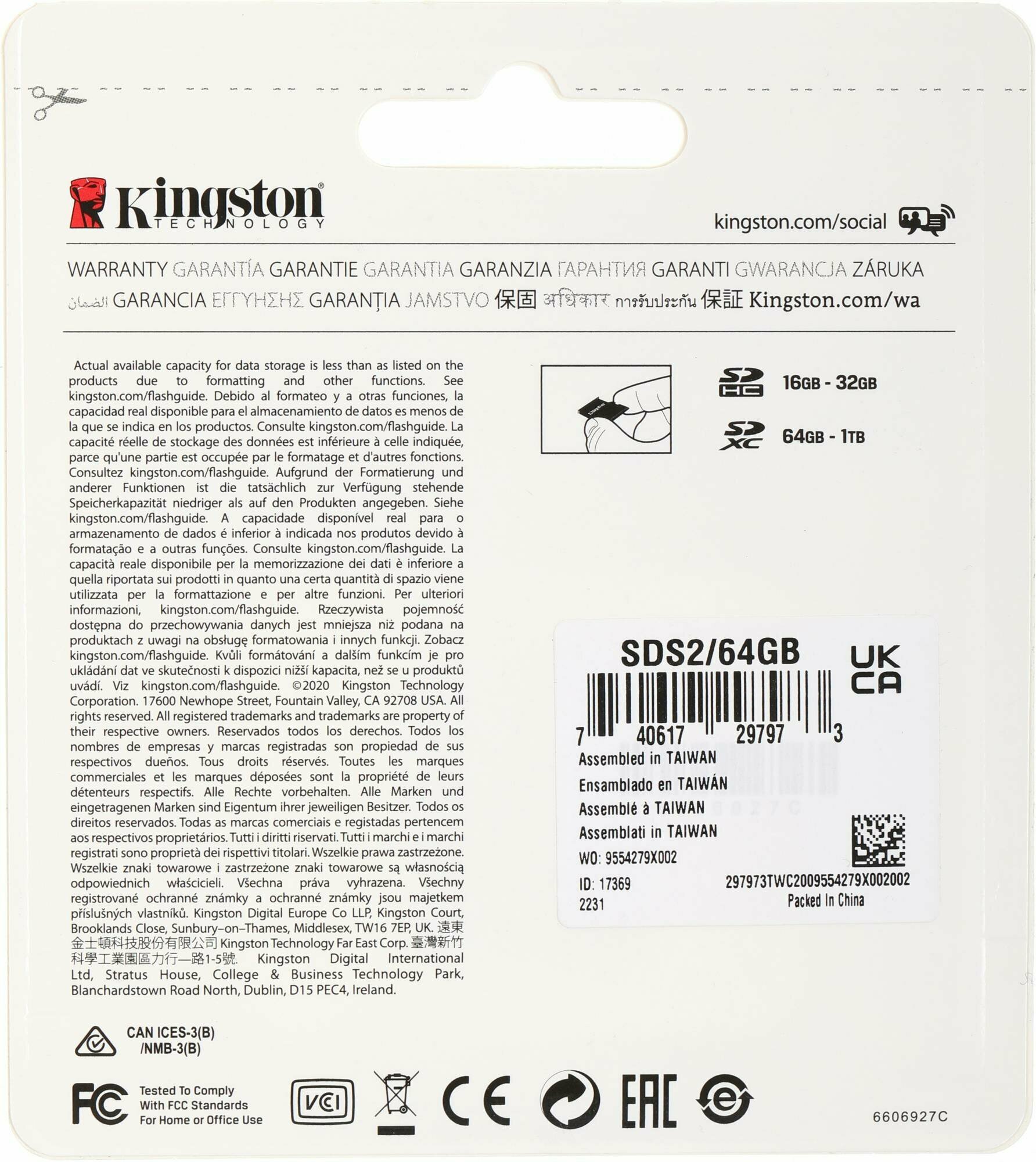 Карта памяти KINGSTON SDXC 64GB C10 SDS2/64GB