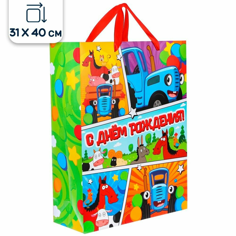 Пакет подарочный Синий Трактор, С Днем рождения, зеленый, 31х40х11,5 см интересное: