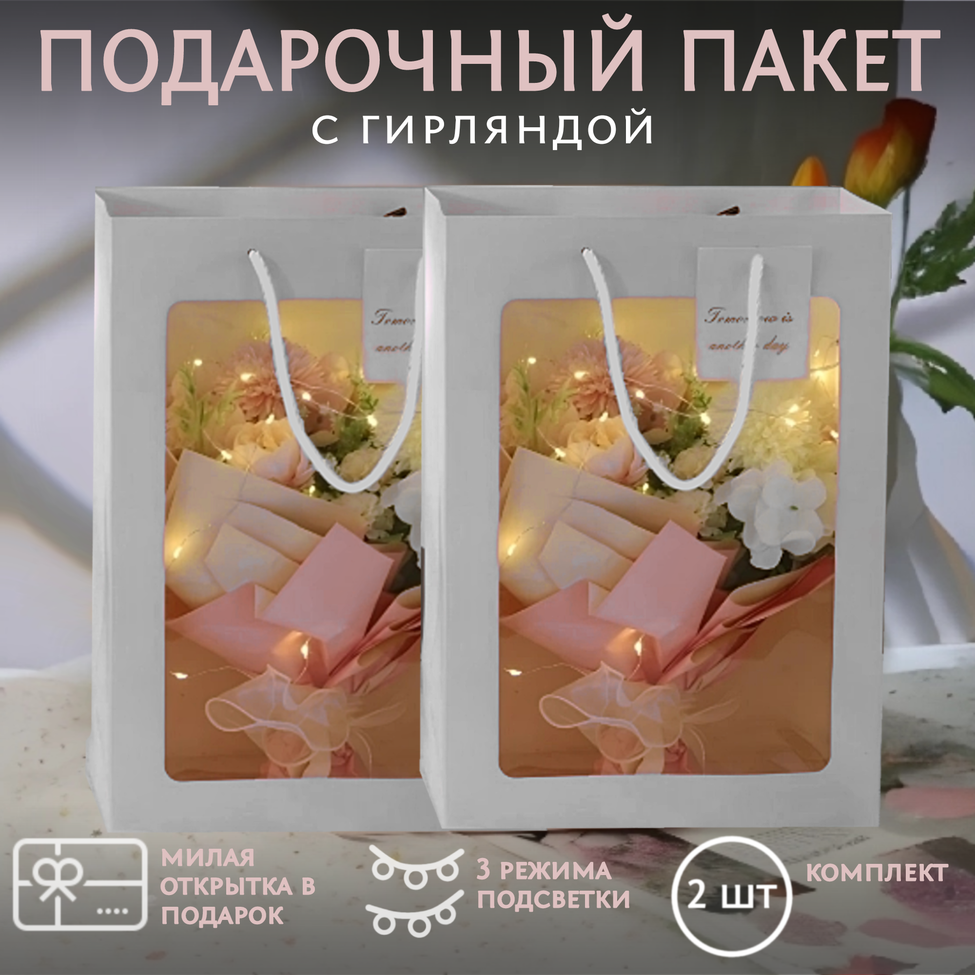 Пакет комплект 2 штуки 35*25*15 подарочный с окном и гирляндой /Подарочная упаковка ZX/Сумка интересное: