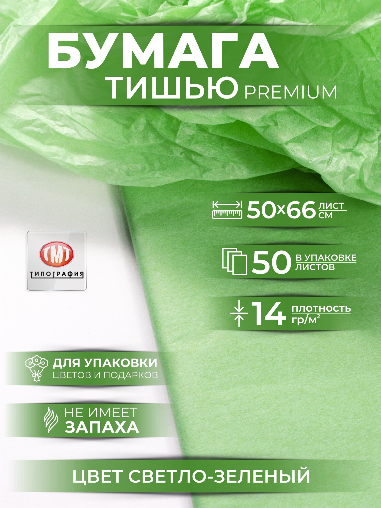 Купить Упаковочная бумага тишью от бренда Типография "ТМТ", 50х66см, набор 50 листов, цвет светло-зеленый