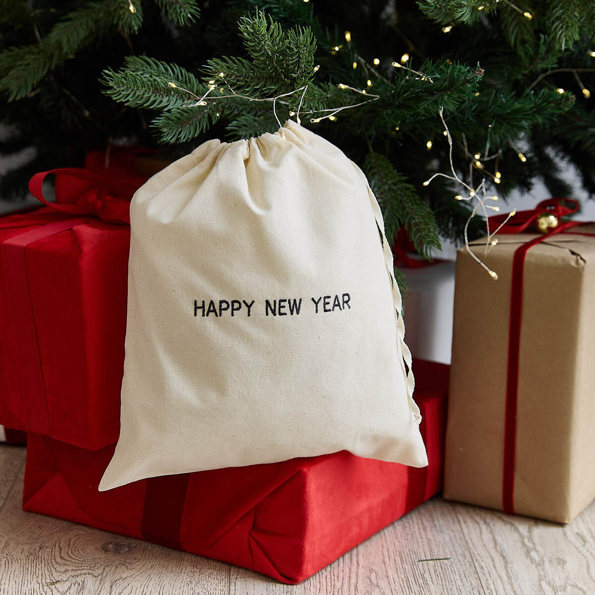 Купить Мешок подарочный Берегите птиц с вышивкой "Happy New Year", хлопок, 100%, бежевый, 31x26 см