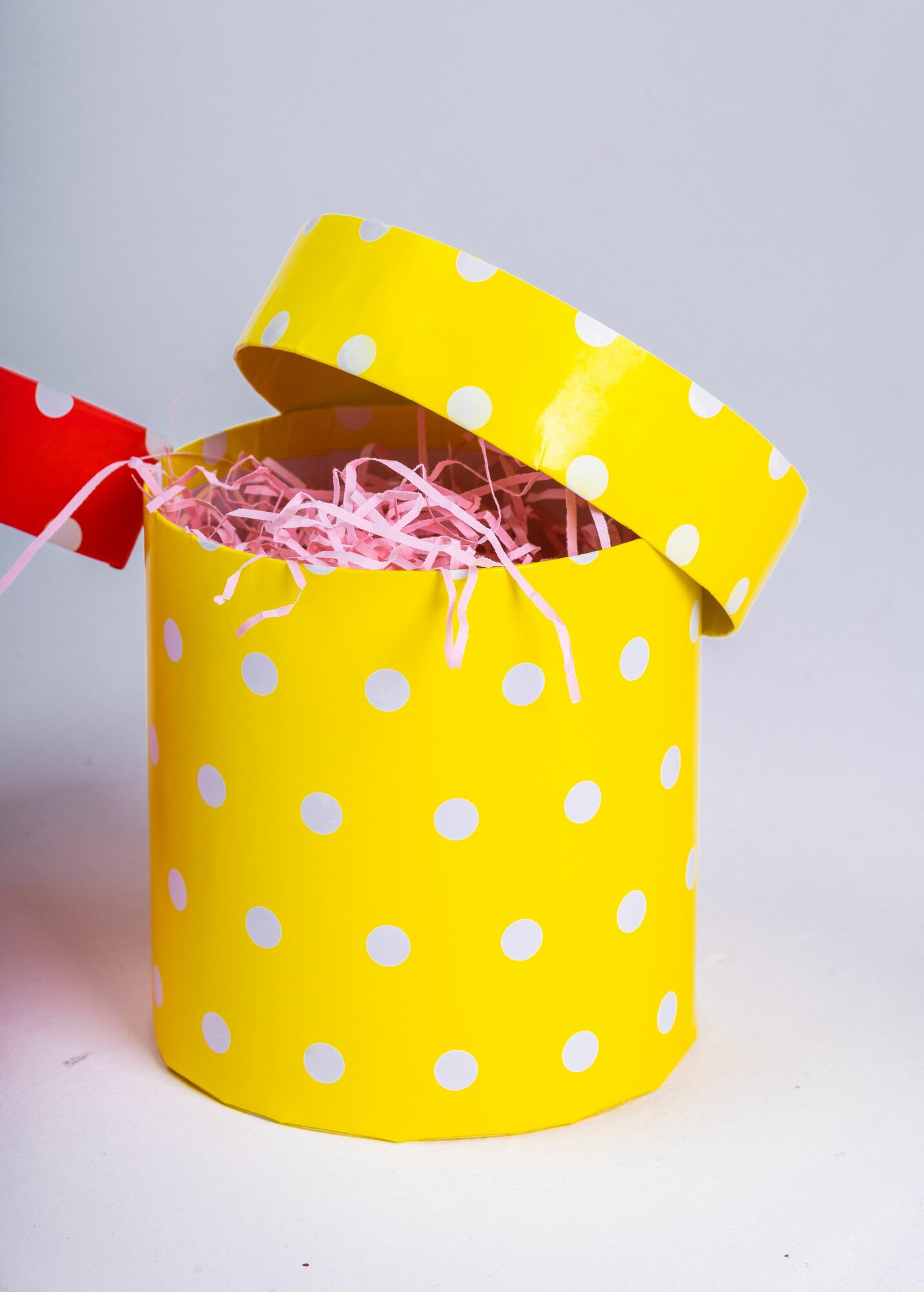 Подарочная коробка крышка-дно, квадратная 19 x 19 x 10,5 см. "Веселые горошки", желтый, белый