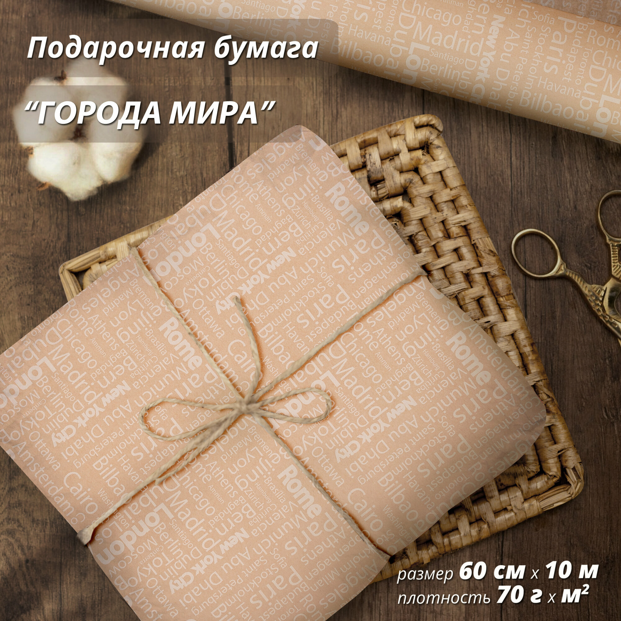 Купить Упаковочная бумага Wooden Dreams "Города мира" 60 см* 10 м, для подарков и цветов, подарочная, флористическая, в рулоне