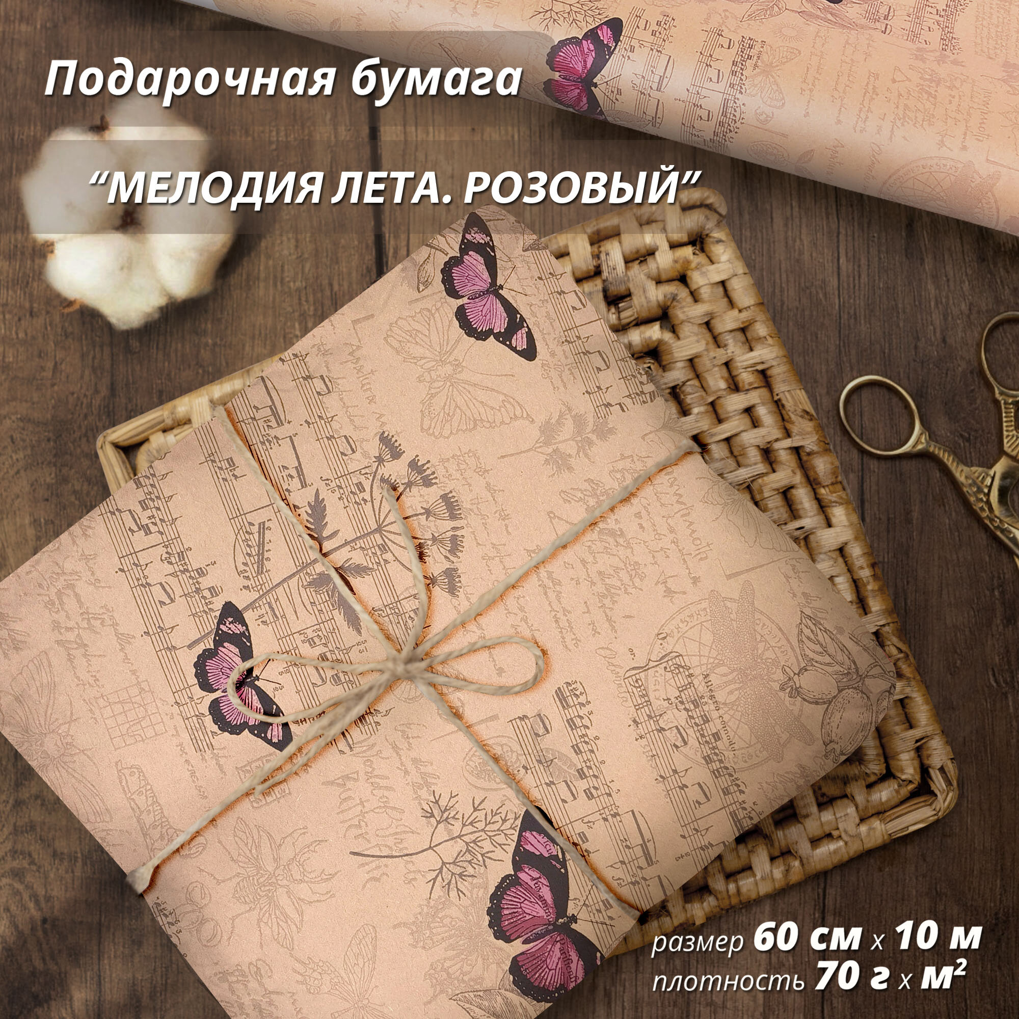 Упаковочная бумага Wooden Dreams "Мелодия лета" 60 см* 10 м, для подарков и цветов, подарочная, флористическая, в рулоне