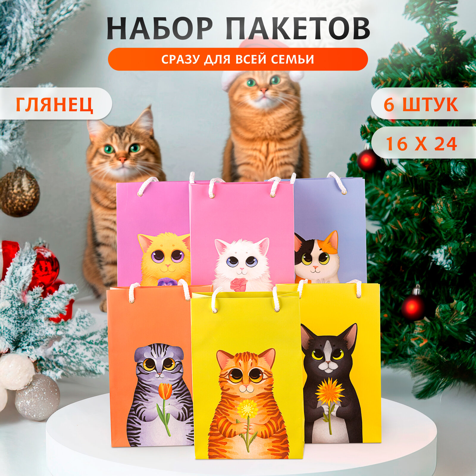 Подарочные пакеты новогодние RUMBA "котики", глянцевые, бумажные, 24x16x8 см, 3шт