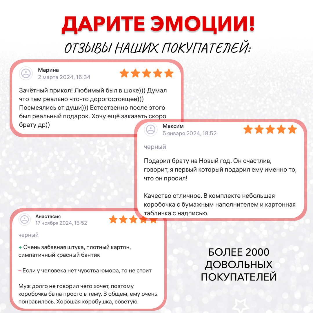 Ниже Вы можете прочитать отзывы на Подарочная коробка прикол "Ничего" для денег или смешного подарка с юмором, ознакомится с подробными характеристиками, посмотреть интересные обзоры и фотографии на Подарочная коробка прикол "Ничего" для денег или смешного подарка с юмором.