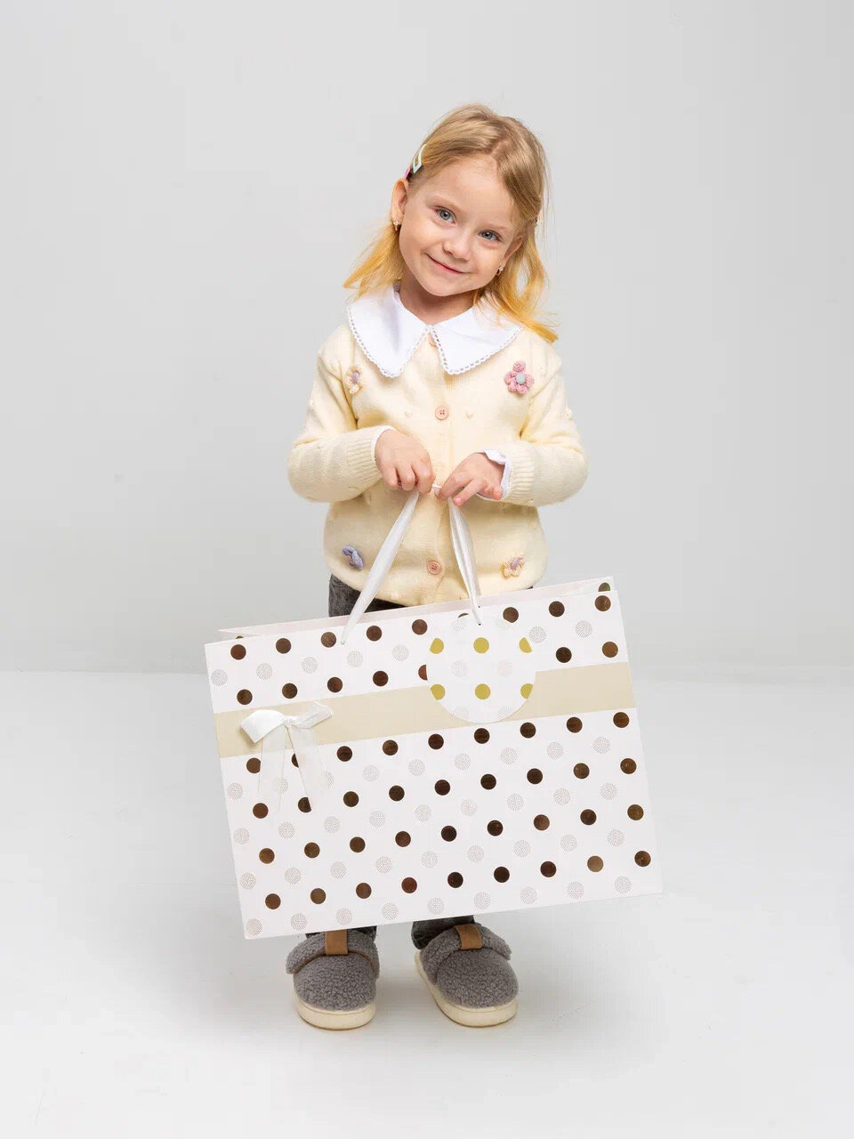 Купить Пакет подарочный большой белый на Новый Год в горох для мамы и подруги из плотного картона на 8 марта
