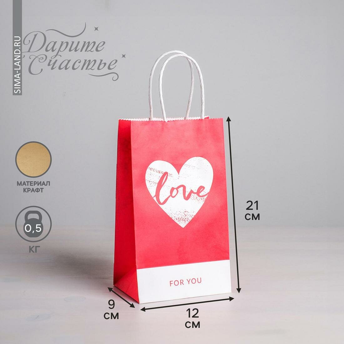 Дарите Счастье Пакет подарочный крафт Love, размер 12 х 21 х 9 см