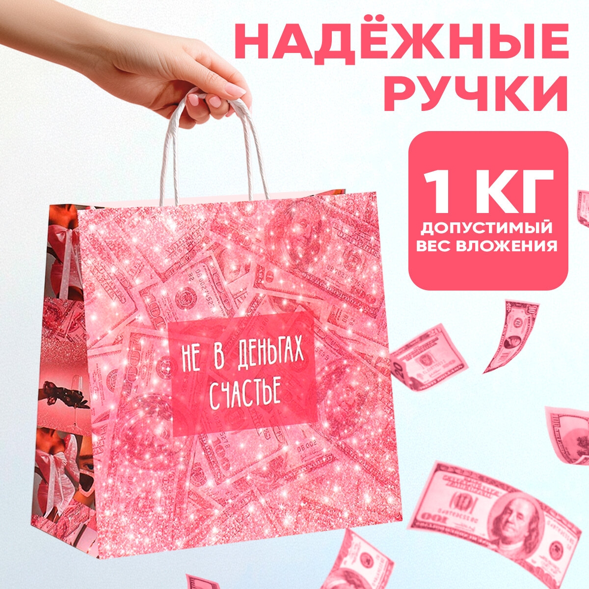 Пакет подарочный «Счастье в бабках», 22 х 22 х 11 см, розовый, для упаковки подарка интересное: