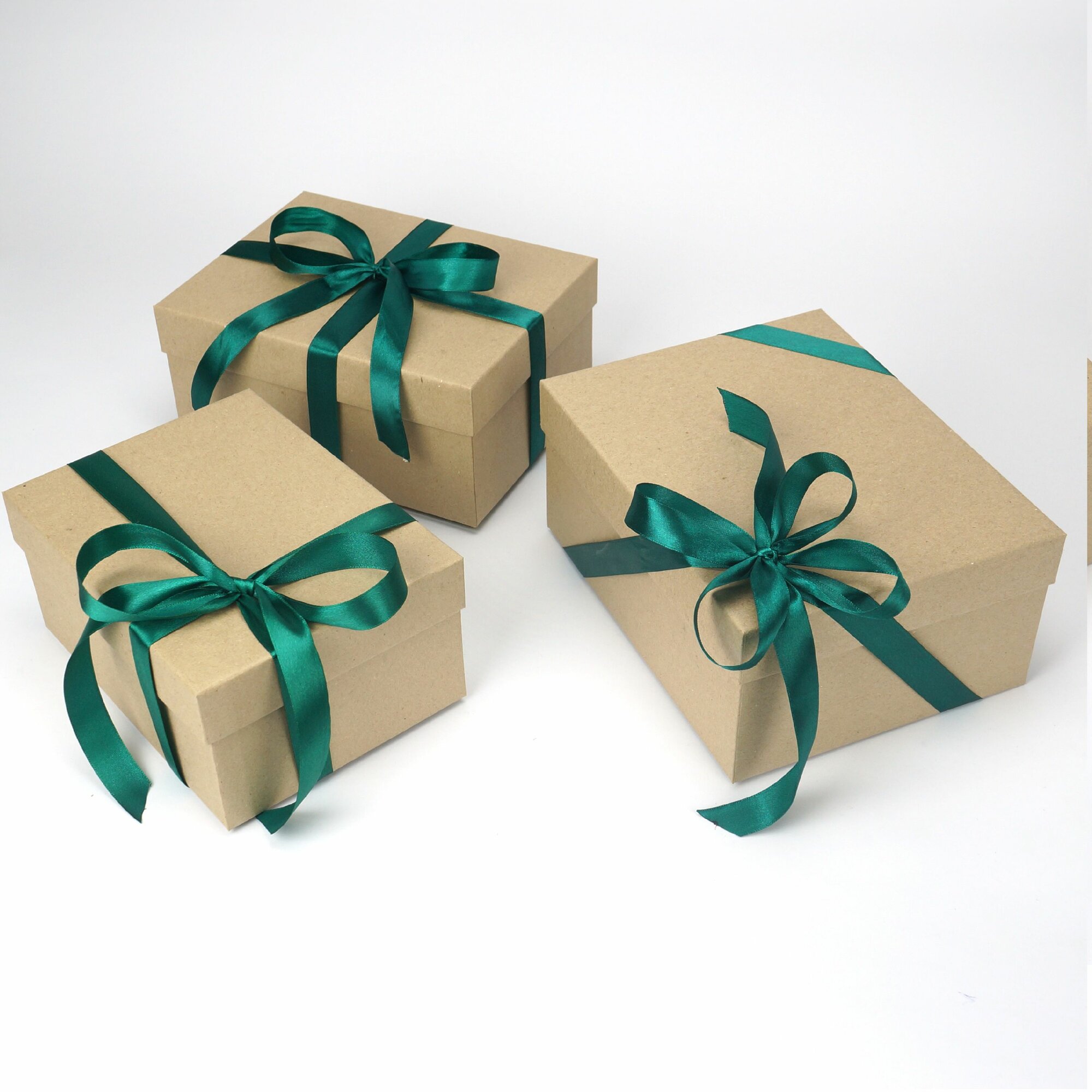 Купить Набор из 3-х крафтовых коробок для упаковки подарков, бумажный наполнитель и атласные ленты зеленого цвета