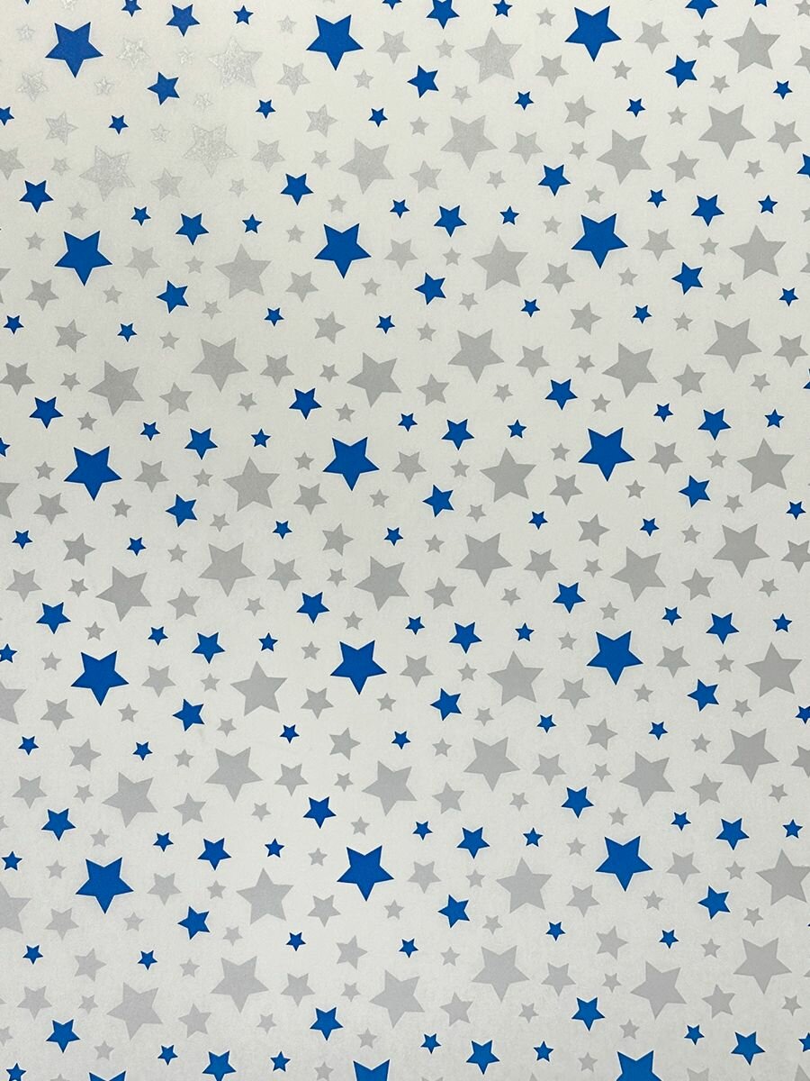 Купить Новогодняя упаковочная бумага для подарков белая крафт 70см x 10м Звезды синий, серебро