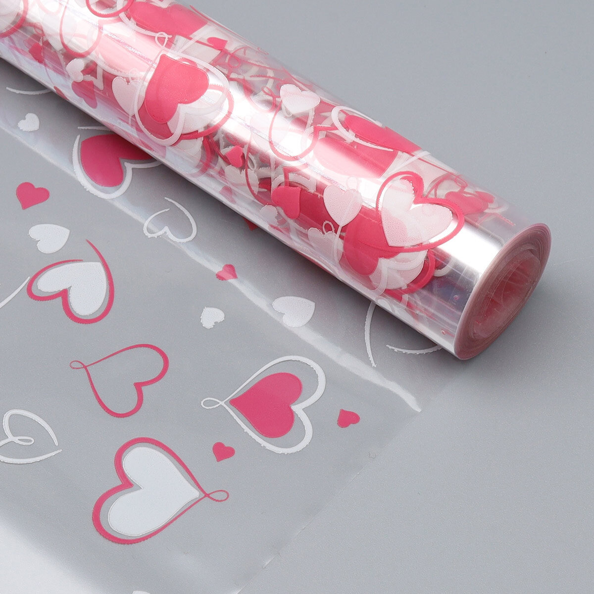 Купить Пленка упаковочная для цветов и подарков прозрачная Айрис 'Сердечки' (бело-розовые), двухцветная, 70 см*7,7 м, 200 г