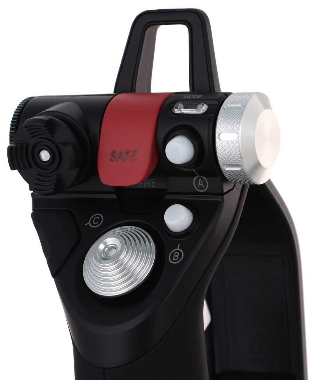 Гашетка (я посчитал её как одну в тех 10-и) на самом деле двух-кнопочная. Сначала нажимается одна кнопка при лёгком нажатии, а потом при нажатии до упора вторая (первая нажата). При помощи переключателя режимов можно например назначать режим боя (когда гашетка стреляет) и мирный режим (какая-нибудь другая функция). Естественно остальные кнопки тоже можно переназначать в зависимости от режима. Каждый из 3-х режимов имеет свой цвет светодиода -- синий, фиолетовый, красный. На ручке двигателя 11 кнопок и 3 аналоговых регулятора (работают как дополнительные оси). 2 из них поворотные и один слайдер. У покупателя может возникнуть вопрос -- где там столько кнопок. Я, например, тоже ничего по картинке не понял. Но, например, есть там колесо -- крутишь в одну сторону срабатывает одна кнопка (часто, как колесо мыши), крутишь в другую -- другая кнопка, а ещё можно на это колесо нажать -- это будет 3-я кнопка. Уже 3. Рядом 4-х позиционная бляшка -- это уже 7 кнопок. 3 белых кнопки вы видите на картинке, и одна чёрненькая рядом с рычажком мышки (да, да -- там ещё и мышка есть!) -- итого 11. Всего получается 32 кнопки (включая 3 режимных и не считая 8-и позиционного хата), 7 осей. Под мышку правда нужны отдельные дрова, я их не ставил и она у меня не работает. Но думаю, что поставить их никаких проблем. |
