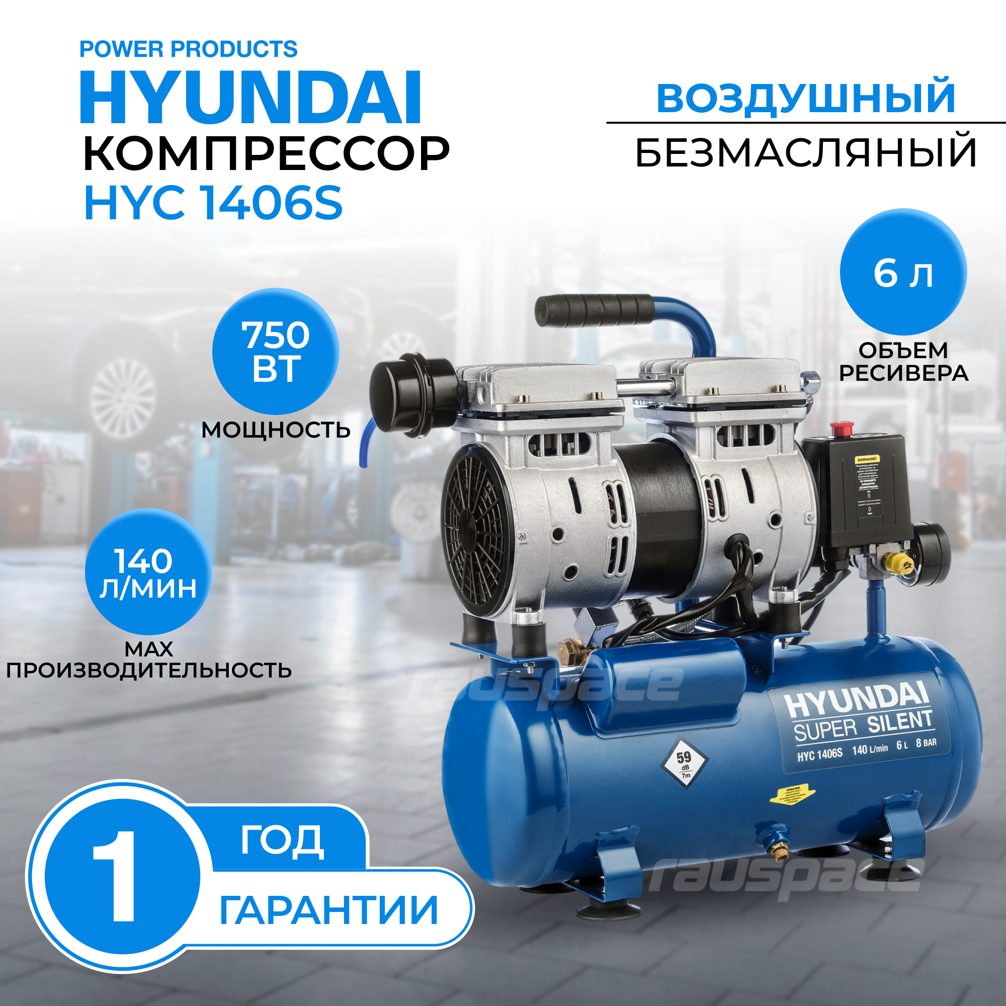 Компрессор поршневой безмасляный Hyundai HYC 1406S, бесшумный, 750 Вт