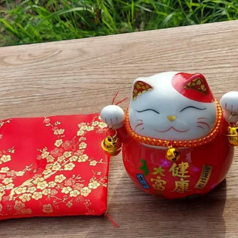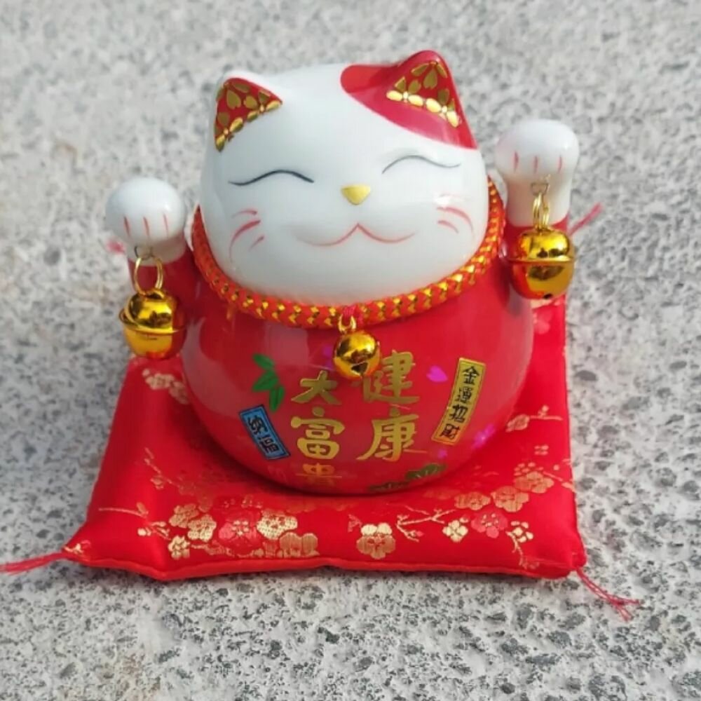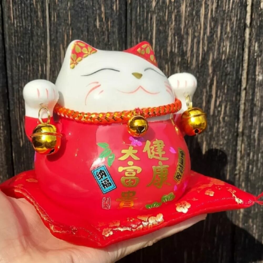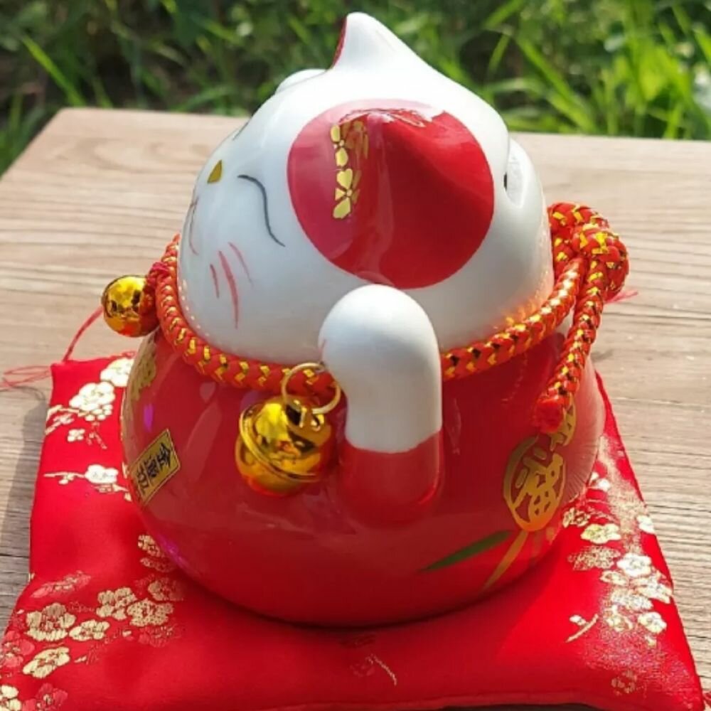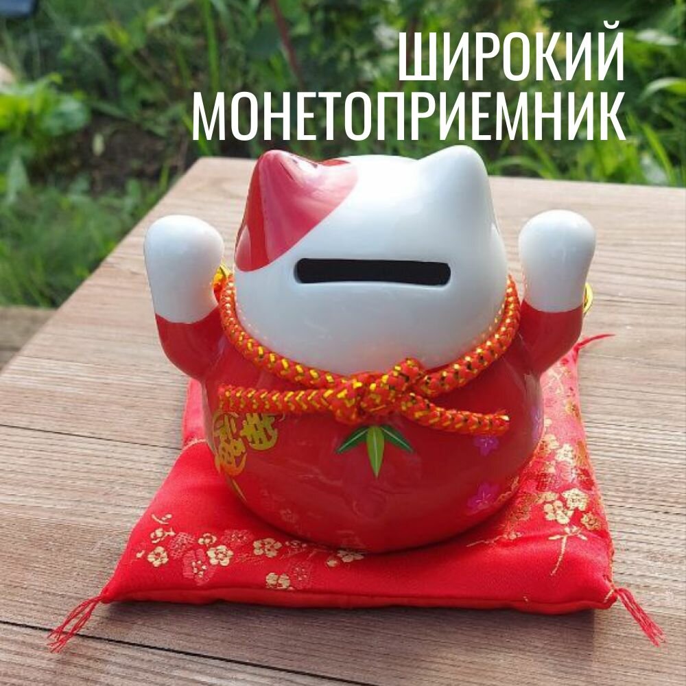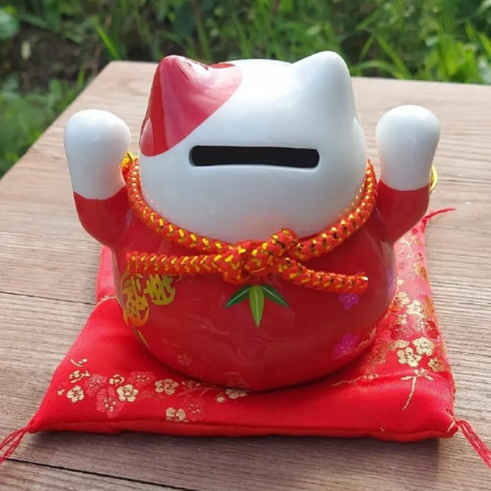 Манэки-Нэко керамическая копилка с красной подушкой интересное: