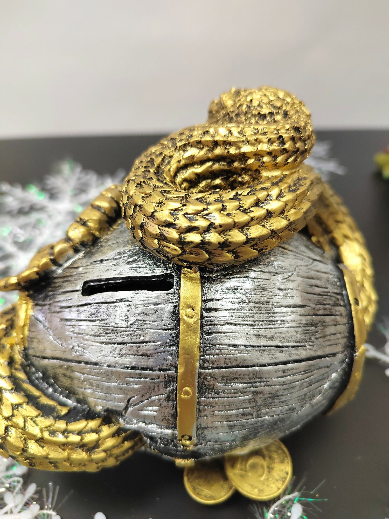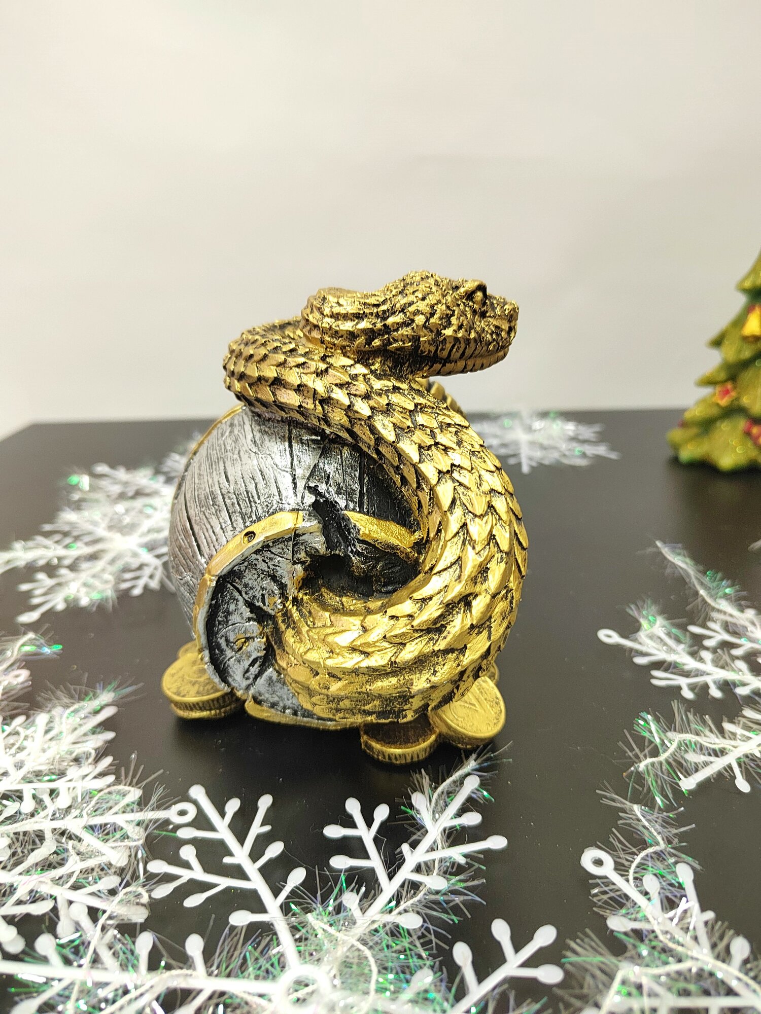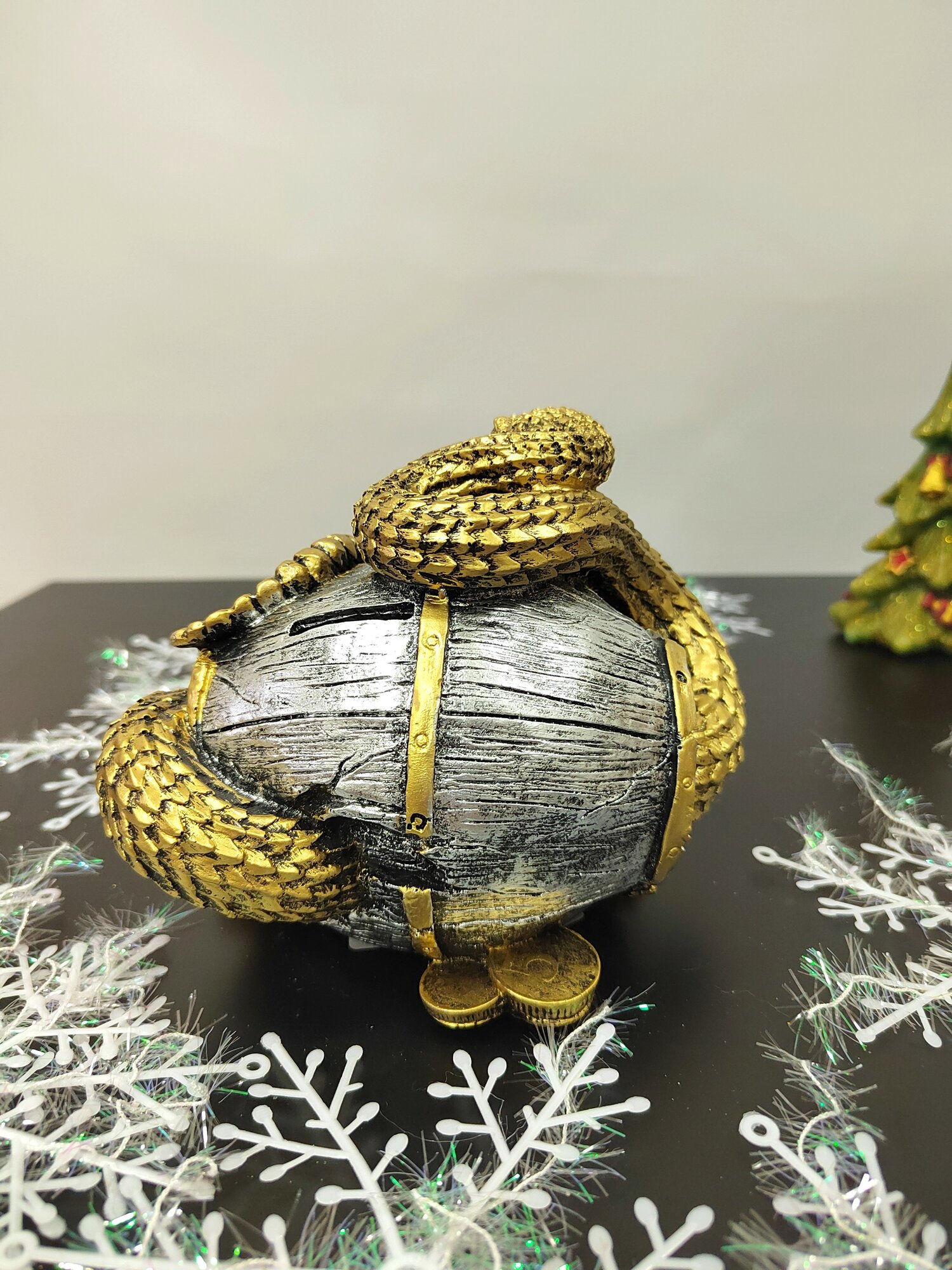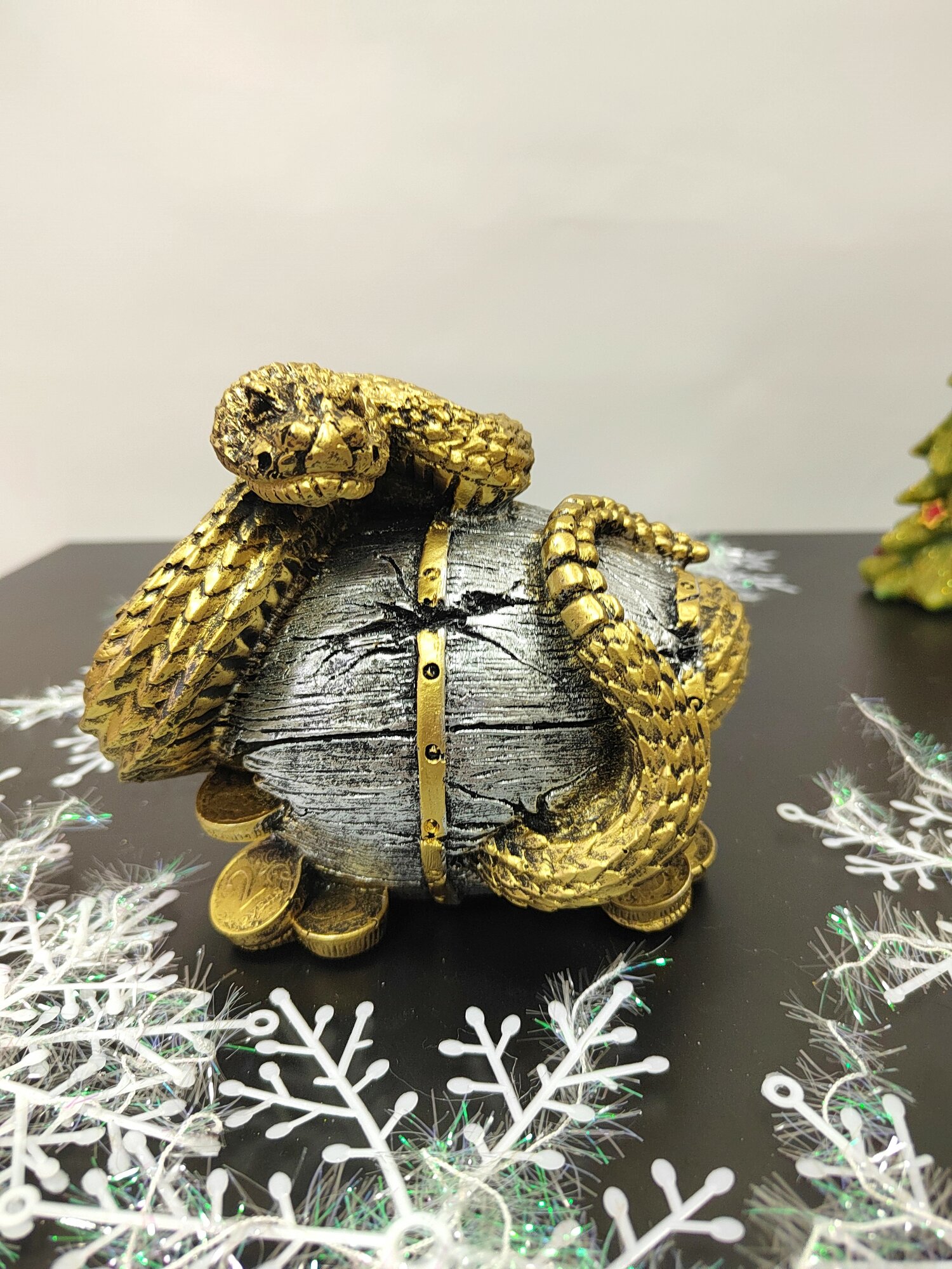 Копилка ЗМЕЯ НА БОЧКЕ декоративная сувенирная для дома и офиса 718532/SK241 (золото+серебро)15*11*12см интересное: