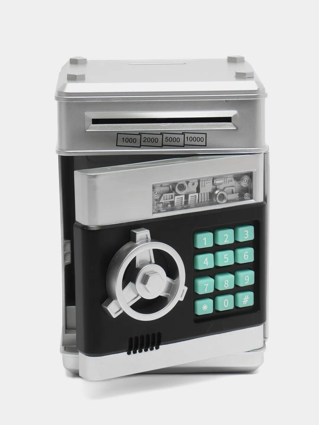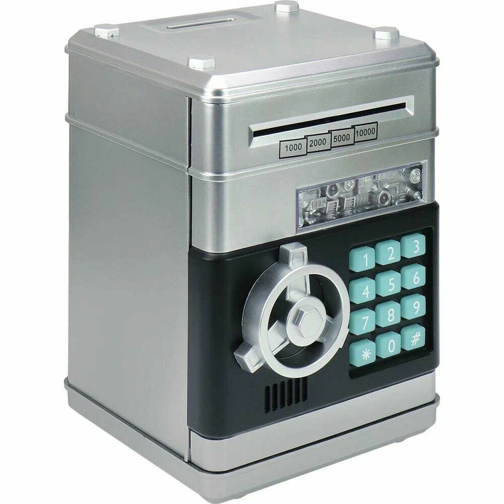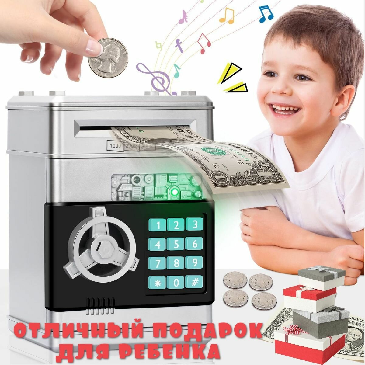 Купить Детская электронная копилка сейф для денег с купюроприёмником и с кодовым замком, серебристая