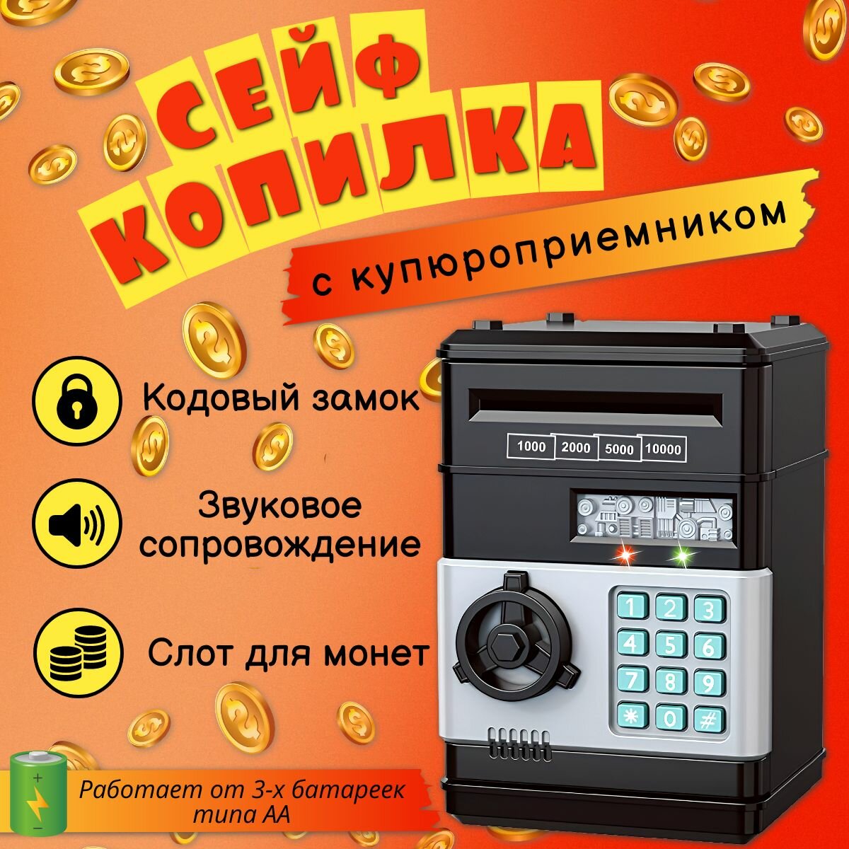 Купить Детская электронная копилка сейф для денег с купюроприёмником и с кодовым замком, черная