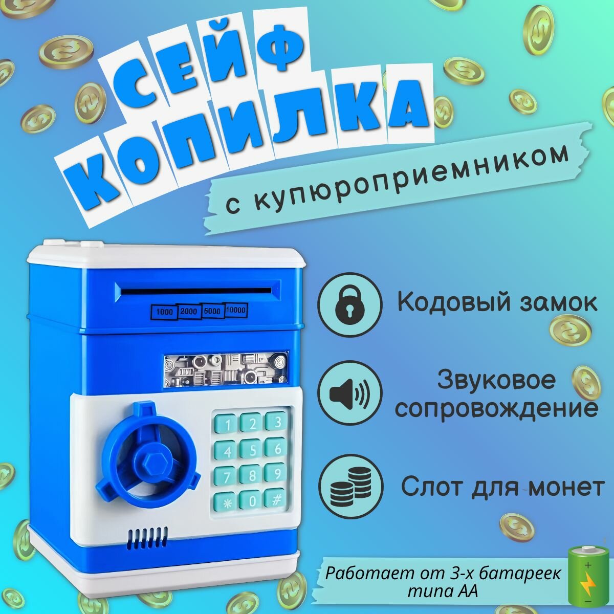 Купить Детская электронная копилка сейф для денег с купюроприёмником и с кодовым замком, голубая