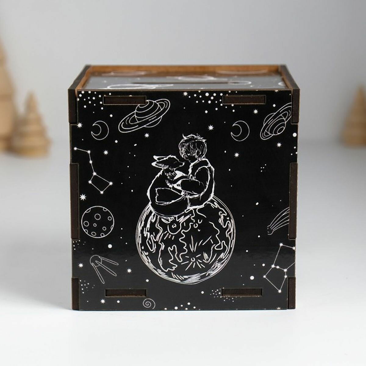 Деревянная копилка для денег "Исполнение желаний", куб, с надписью, 10x10х10 см