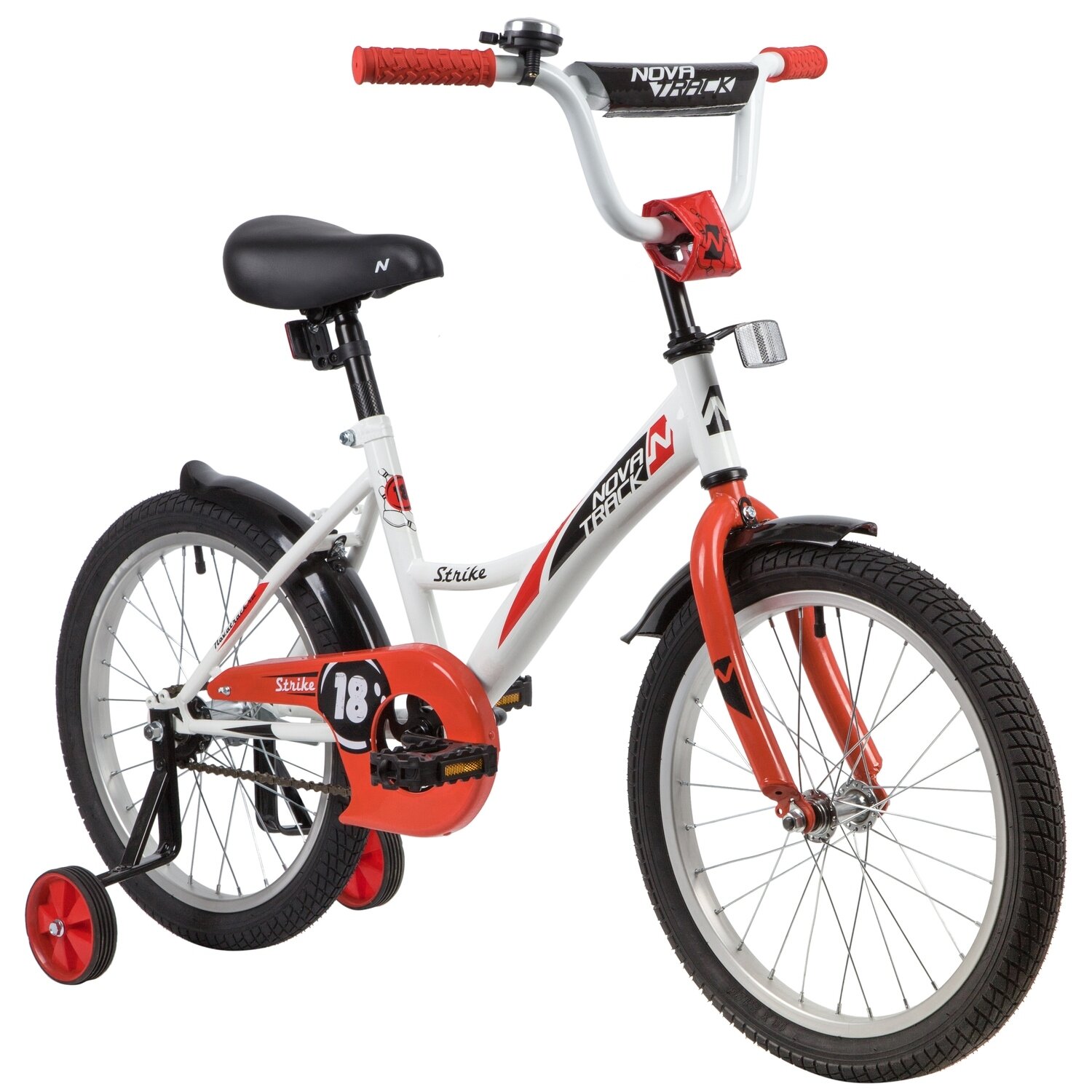 NOVATRACK STRIKE 18" (2020) (Велосипед NOVATRACK 18" STRIKE белый-красный, тормоз нож, крылья корот, защита А-тип)