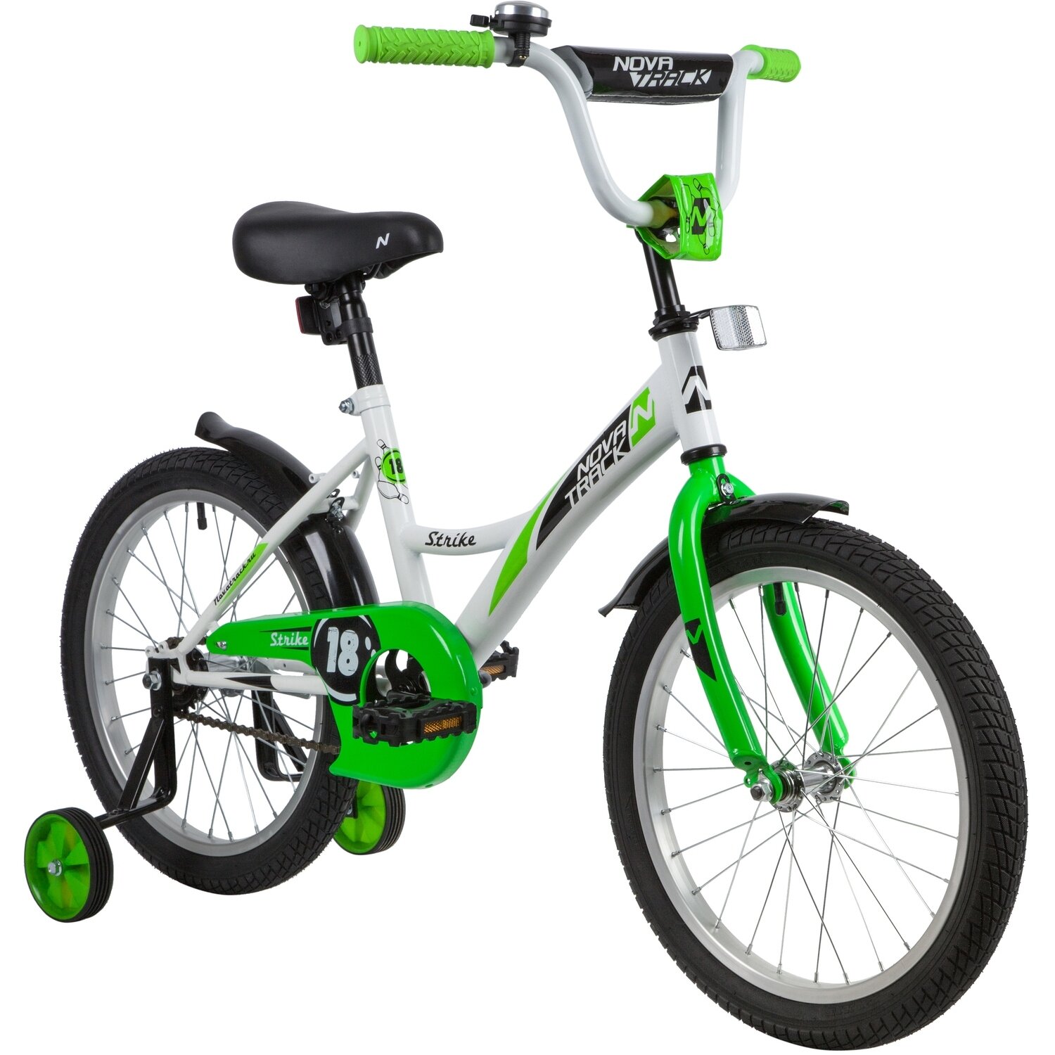 Велосипед NOVATRACK 18" STRIKE белый-зелёный, тормоз нож, крылья корот, защита А-тип