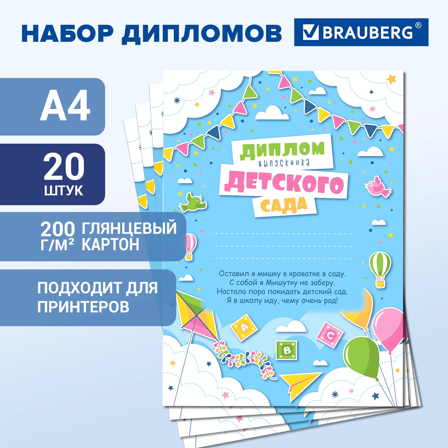 Купить Диплом Выпускника детского сада, грамота детям набор 20 штук, А4, мелованный картон, набор 20 шт, Brauberg, 117539