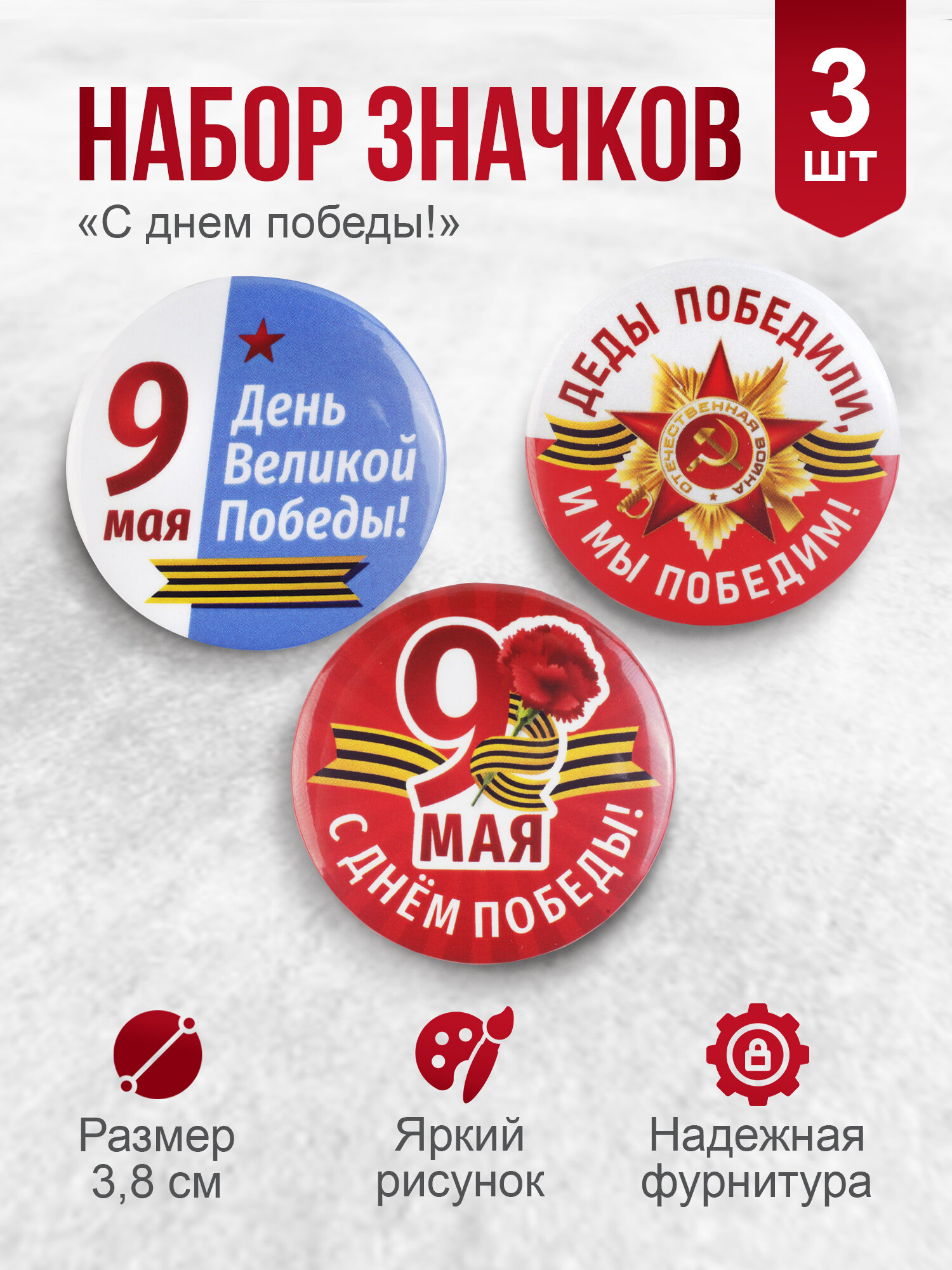 Значки 9 мая, комплект из 3 шт. на подложке / красный фон / подарок на день Победы