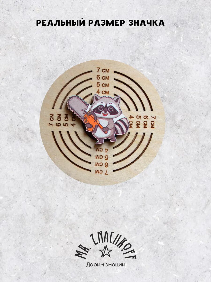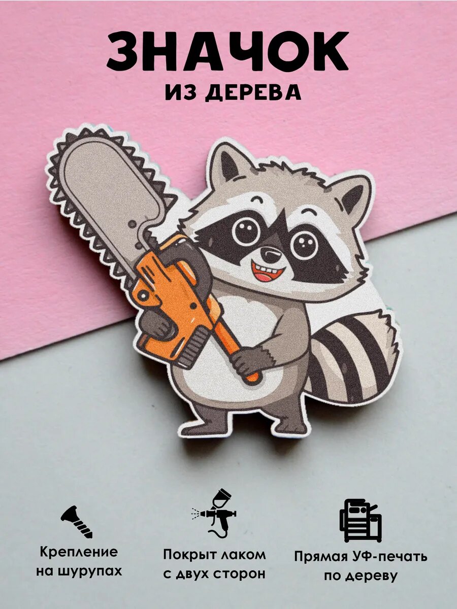 Значок Mr. Znachkoff "Енот с бензопилой", дерево, УФ-печать, влагостойкий, ручная сборка, на рюкзак интересное: