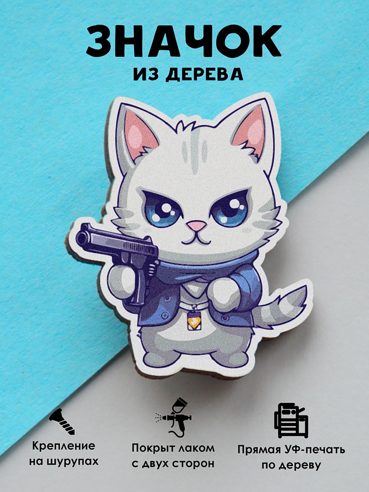 Значок Mr. Znachkoff "Белый котик", дерево, УФ-печать, влагостойкий лак, ручная сборка, на рюкзак интересное:
