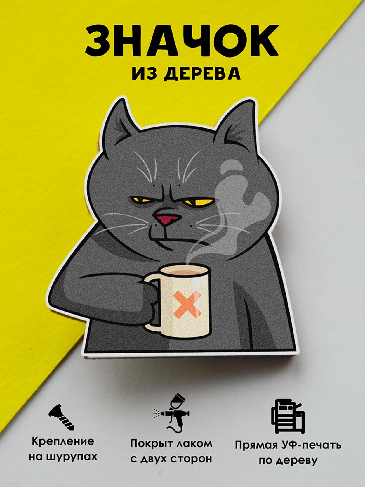 Значок Mr. Znachkoff "Кот с кофе", дерево, УФ-печать, влагостойкий лак, ручная сборка, на рюкзак интересное: