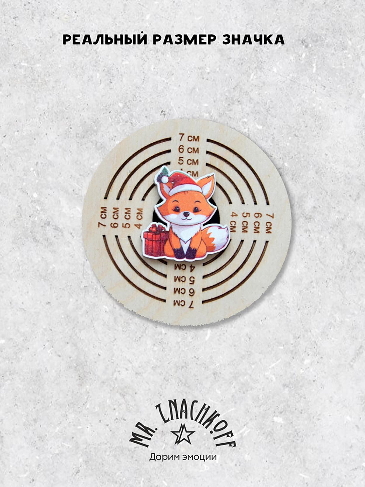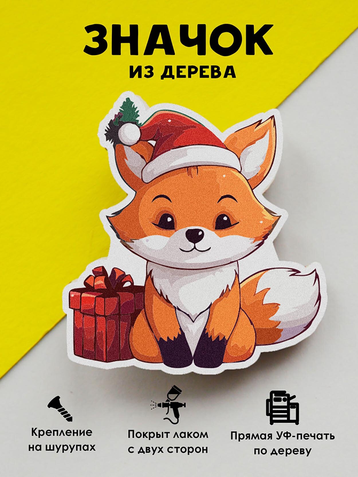 Значок Mr. Znachkoff "Лисица с подарками", дерево, УФ-печать, влагостойкий лак, ручная работа, новогодний интересное: