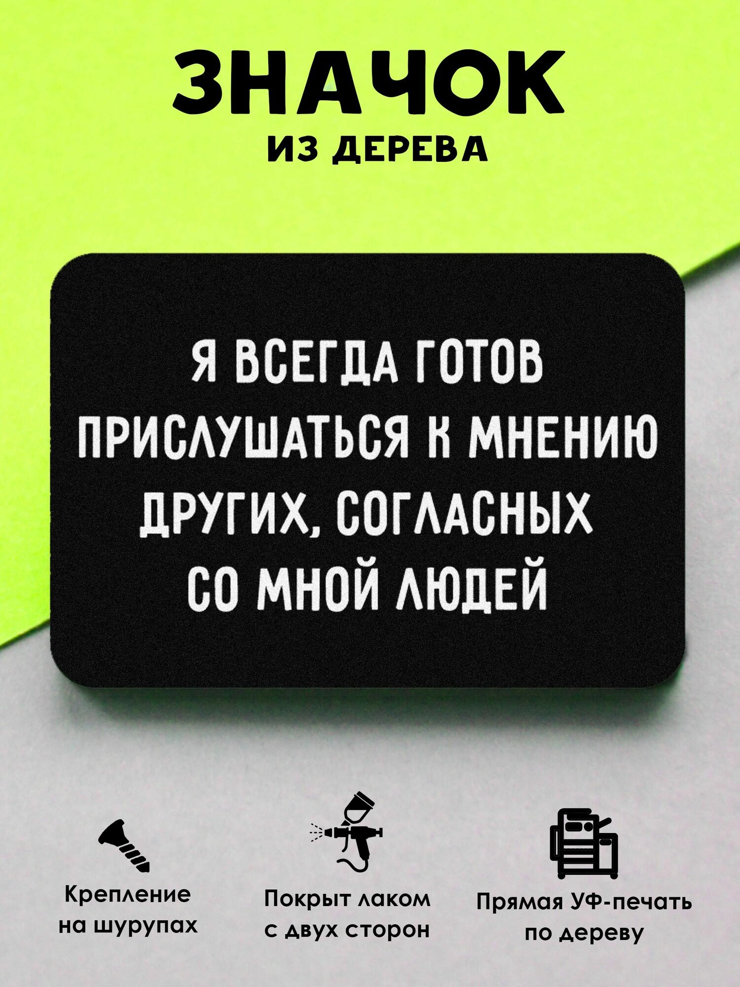 Купить Значок Mr. Znachkoff "Готов прислушаться", дерево, УФ-печать, влагостойкий, на рюкзак, прикольный