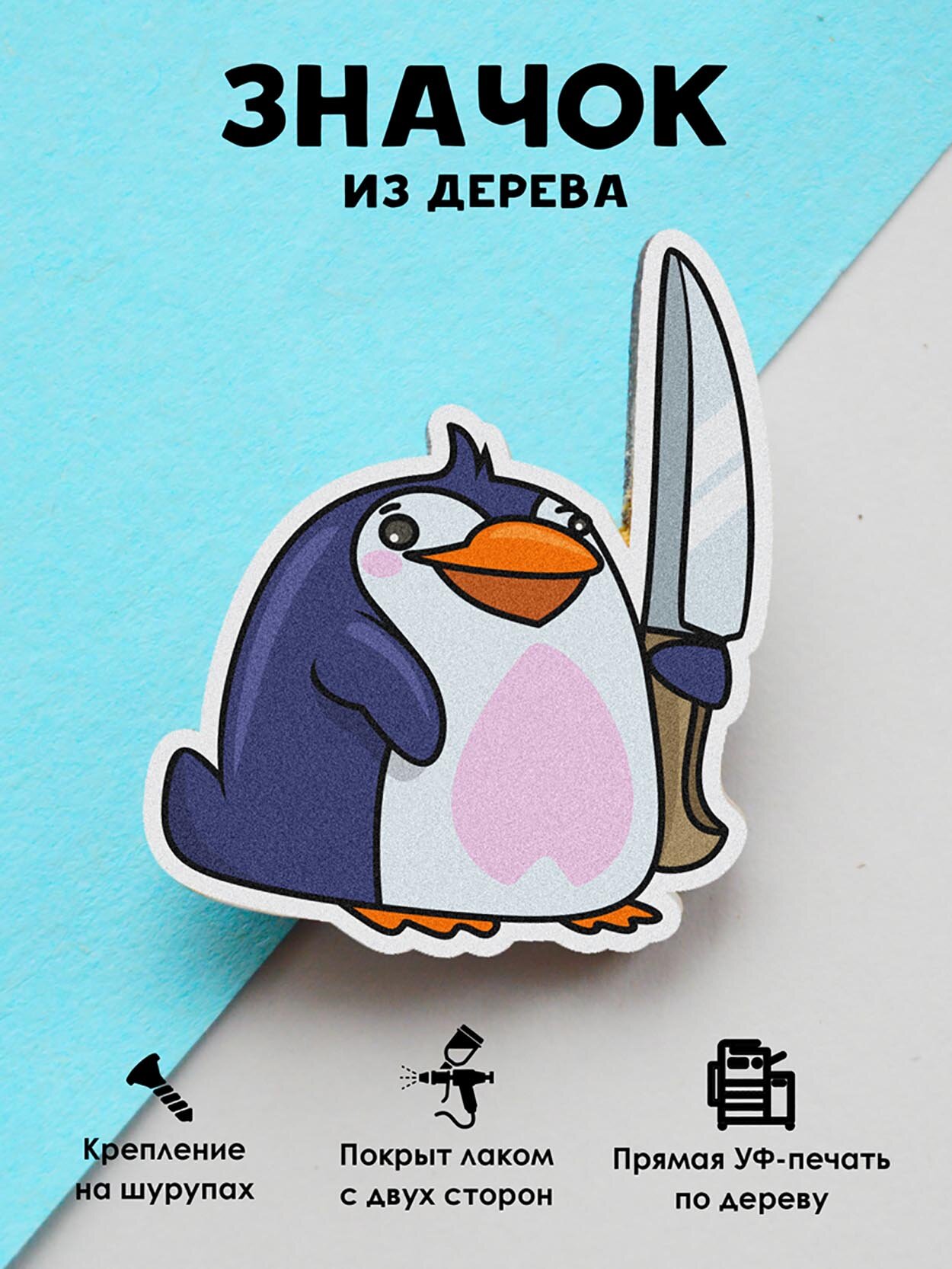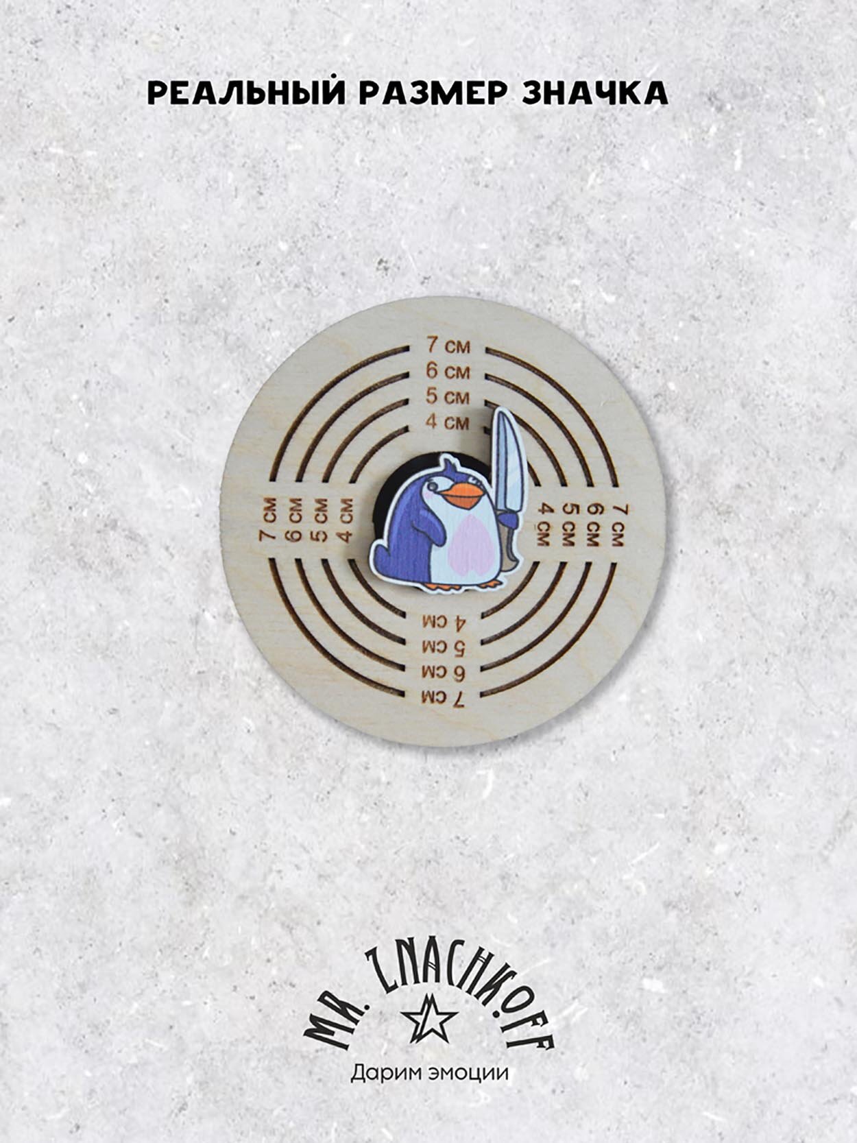Значок Mr. Znachkoff "Пингвинчик с ножом", дерево, УФ-печать, ручная сборка, на рюкзак интересное: