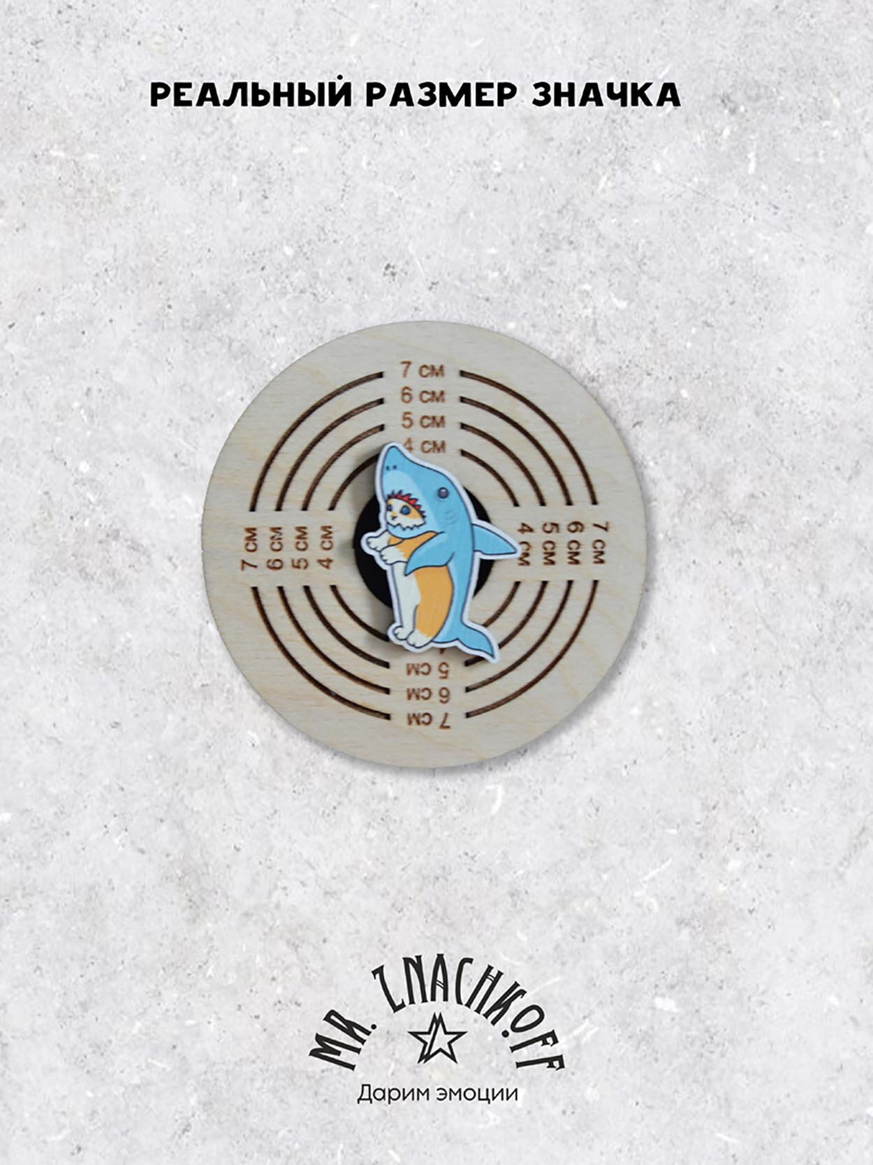 Значок Mr. Znachkoff "Котик-акула", дерево, УФ-печать, ручная сборка, на рюкзак интересное: