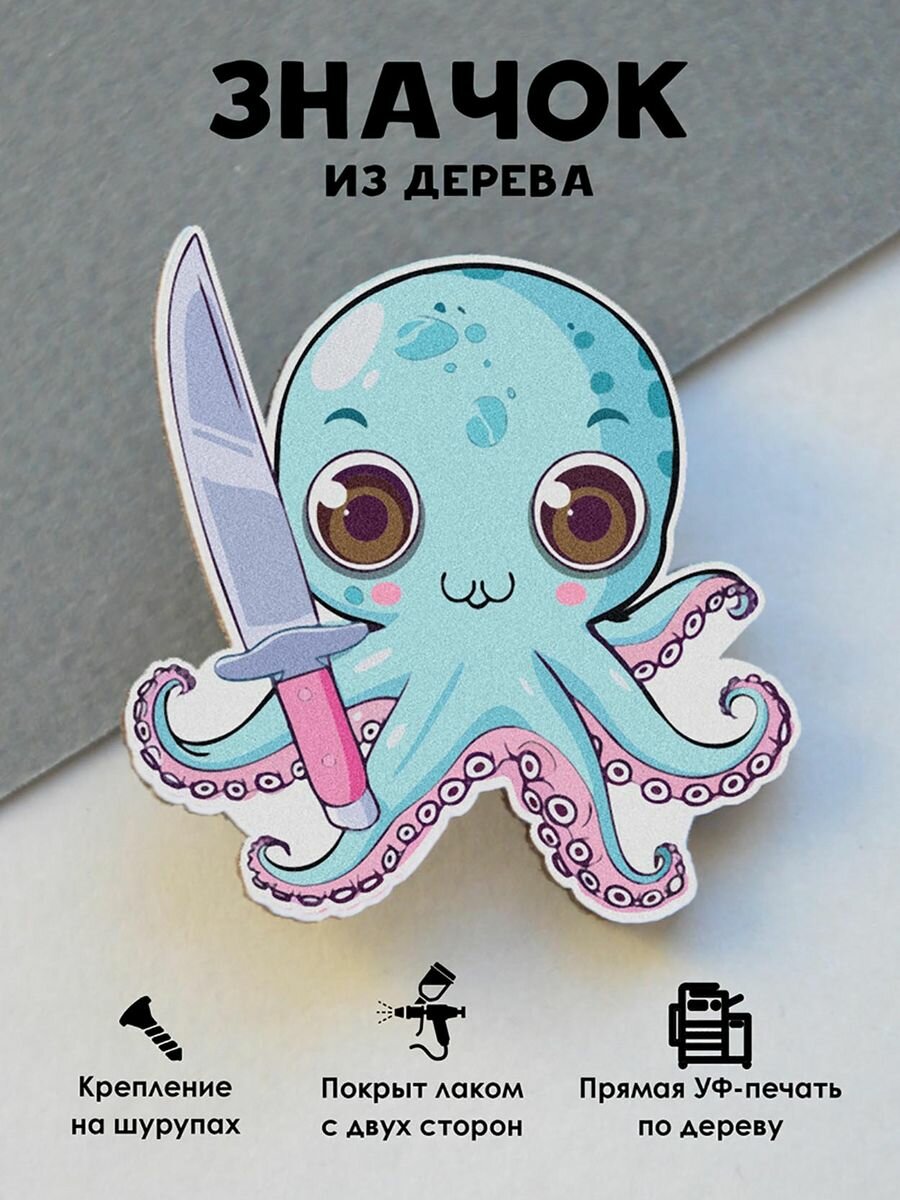 Значок Mr. Znachkoff "Осьминог с ножом", дерево, УФ-печать, влагостойкий лак, ручная сборка интересное: