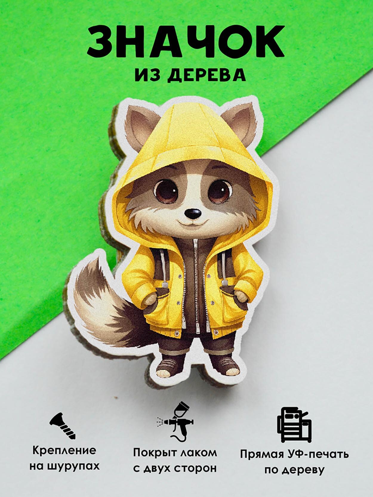 Значок Mr. Znachkoff "Енот в желтом плаще", дерево, УФ-печать, влагостойкий лак, ручная сборка, на рюкзак интересное: