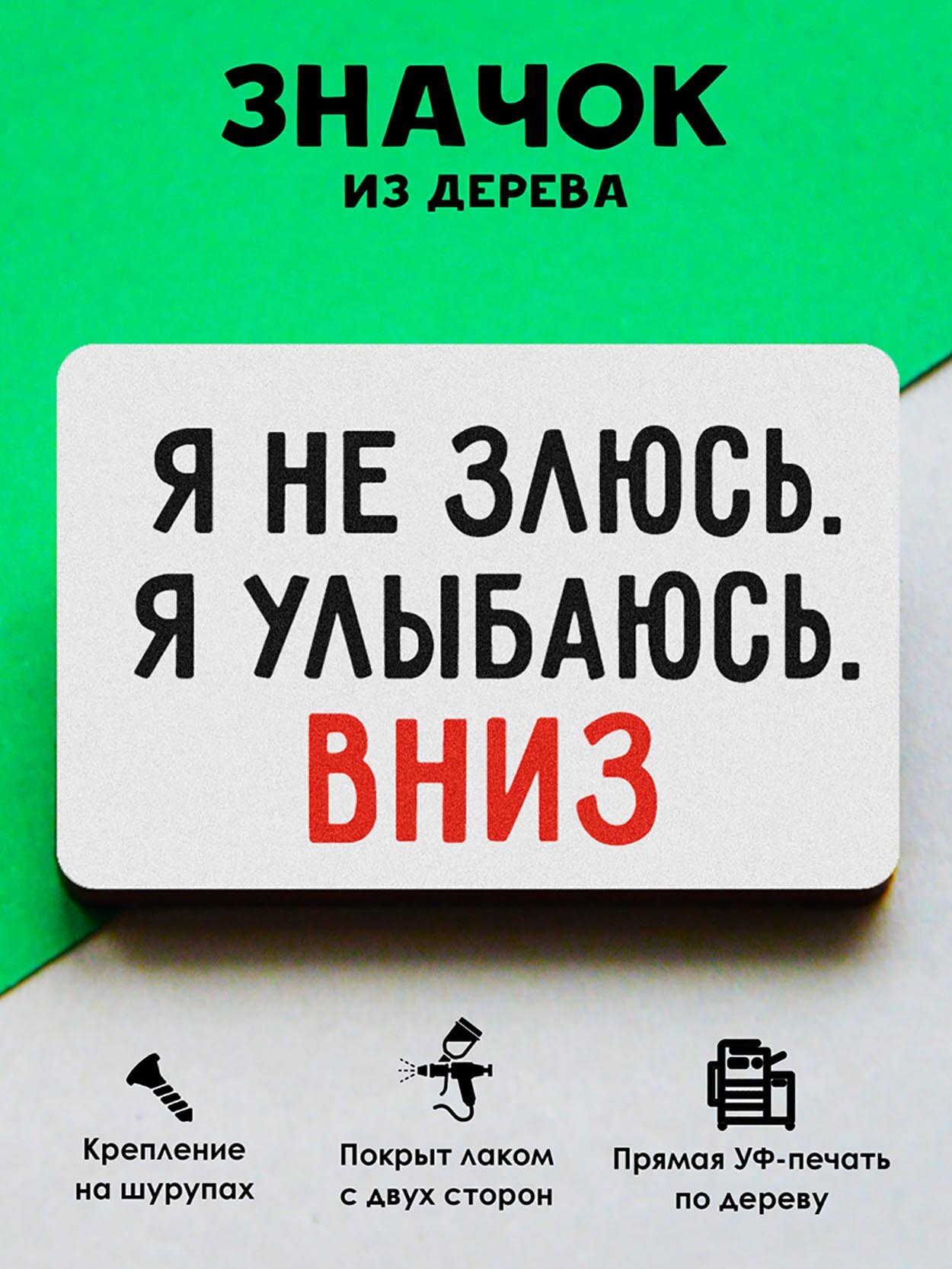 Значок Mr. Znachkoff "Улыбаюсь вниз", дерево, УФ-печать, влагостойкий лак, ручная работа интересное: