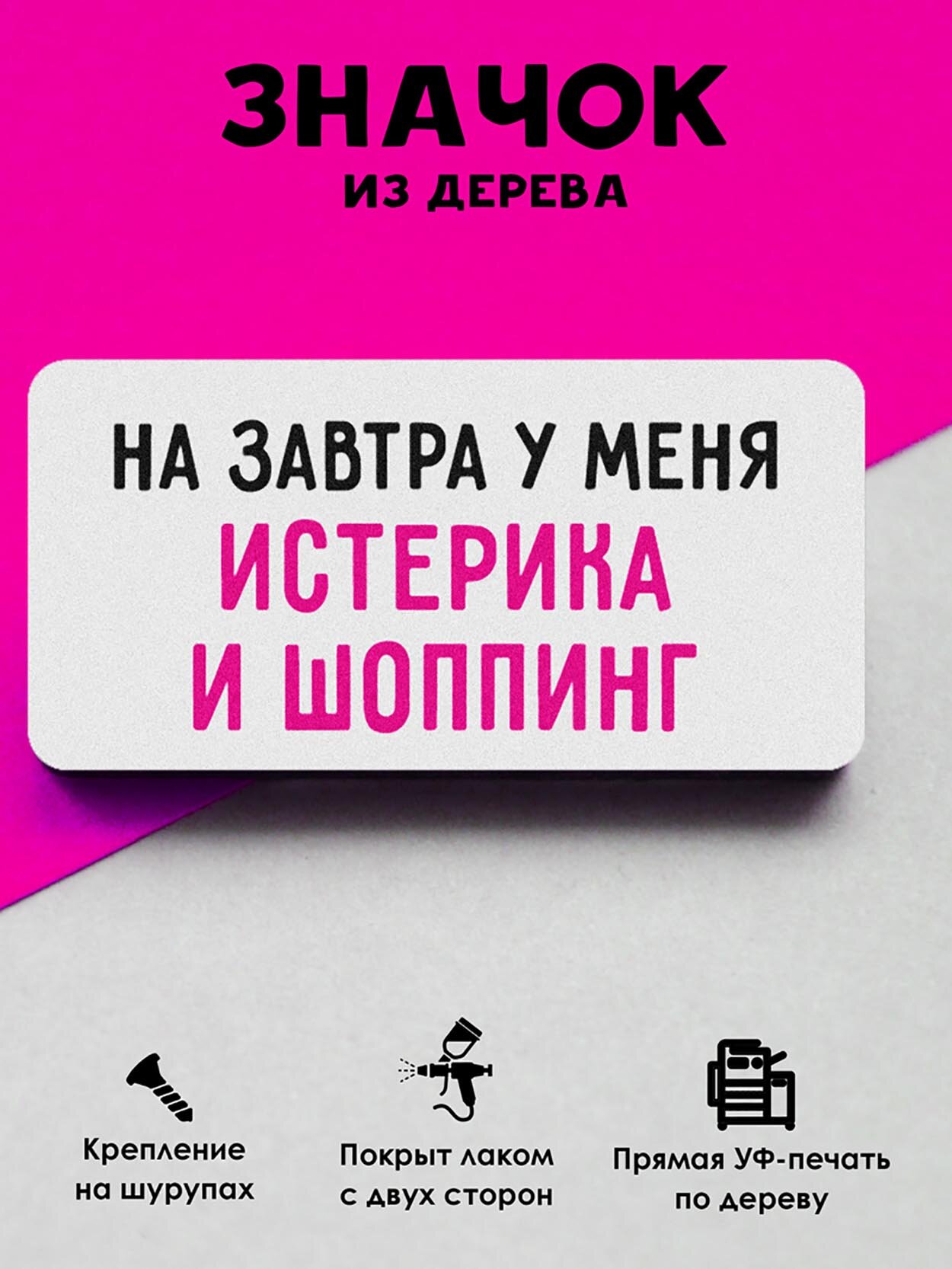 Купить Значок Mr. Znachkoff "Истерика и шоппинг", дерево, УФ-печать, влагостойкий лак, ручная работа