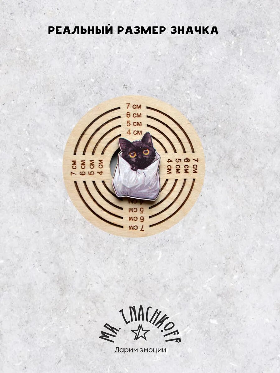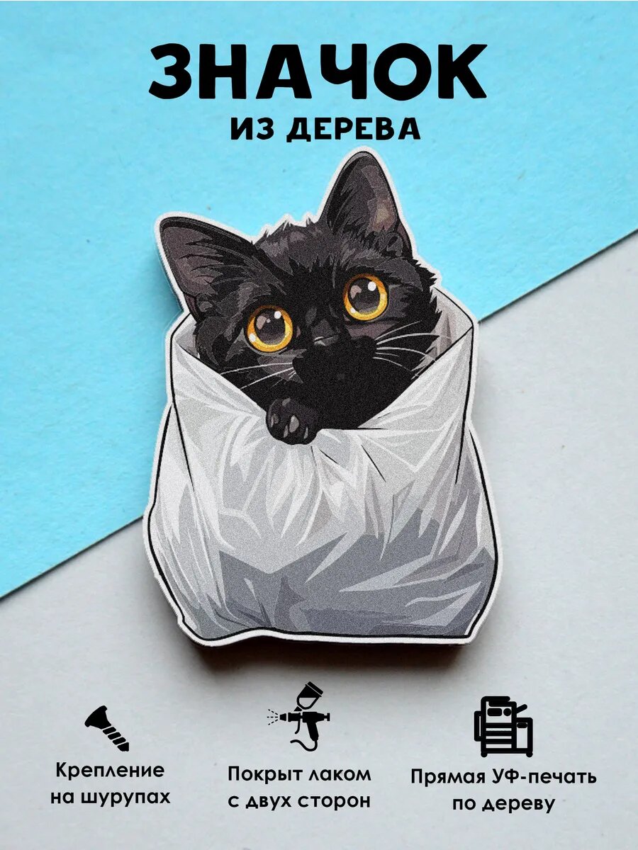 Значок Mr. Znachkoff "Кот в пакете", дерево, УФ-печать, влагостойкий, на рюкзак интересное: