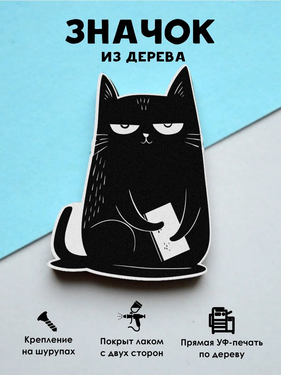 Купить Значок Mr. Znachkoff "Черный кот с телефоном", дерево, УФ-печать, влагостойкий, на рюкзак
