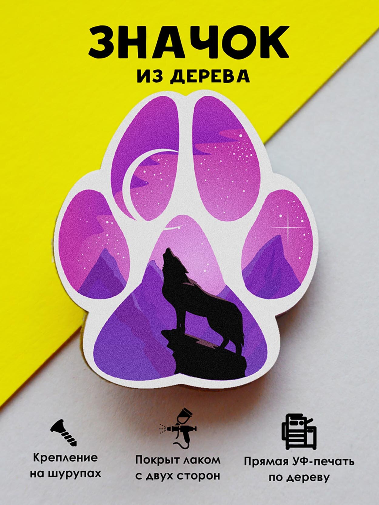 Значок Mr. Znachkoff "Волчий след", дерево, ручная сборка, УФ-печать, на рюкзак интересное:
