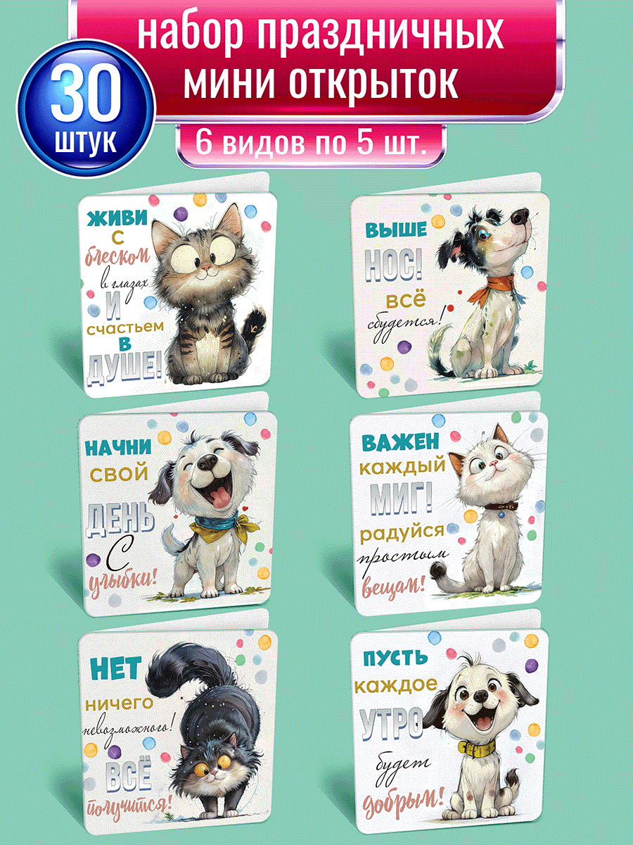 Купить Новогодняя открытка, набор новогодних двухсторонних цветных мини открыток 30 шт.
