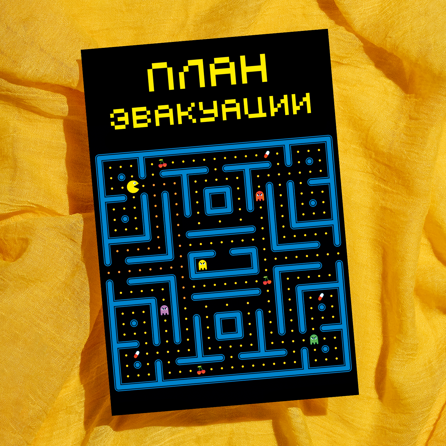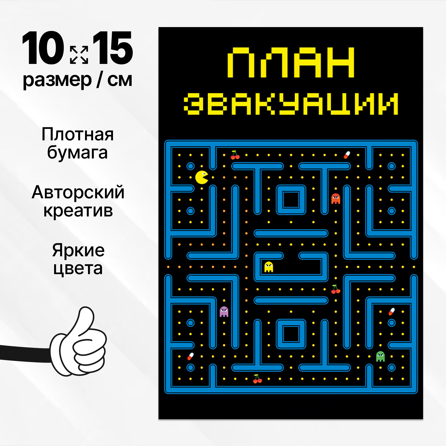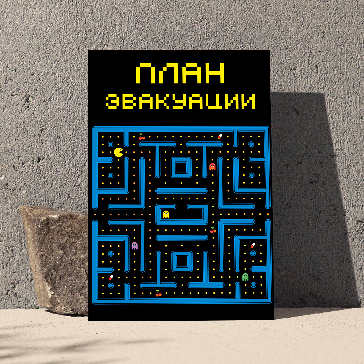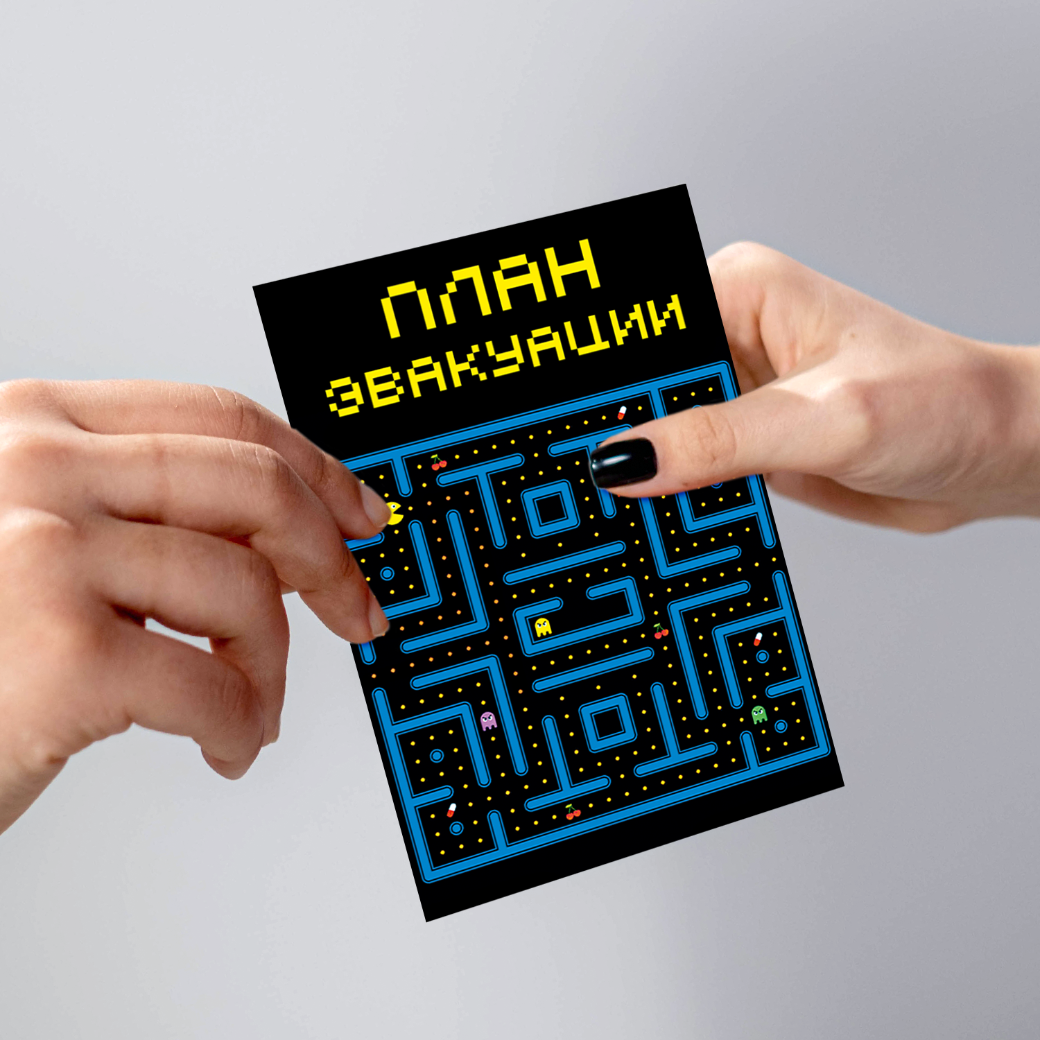 Купить Дизайнерская открытка "План эвакуации PacMan" (10х15см, плотная бумага, авторский креатив)