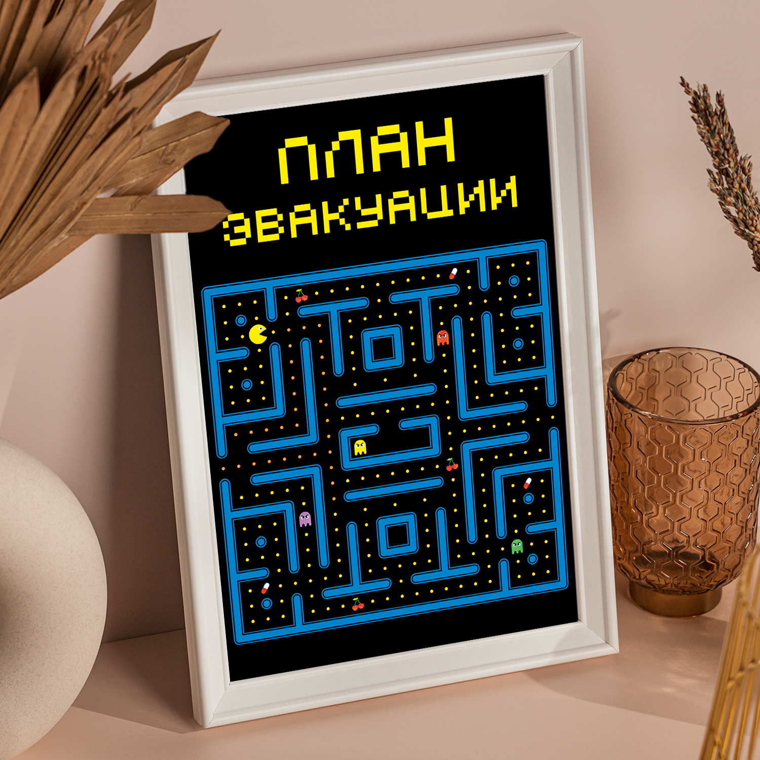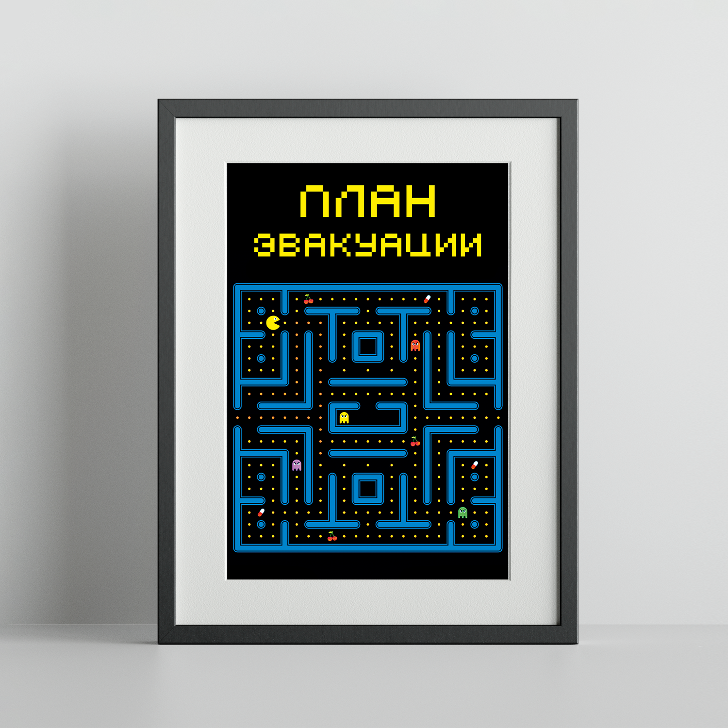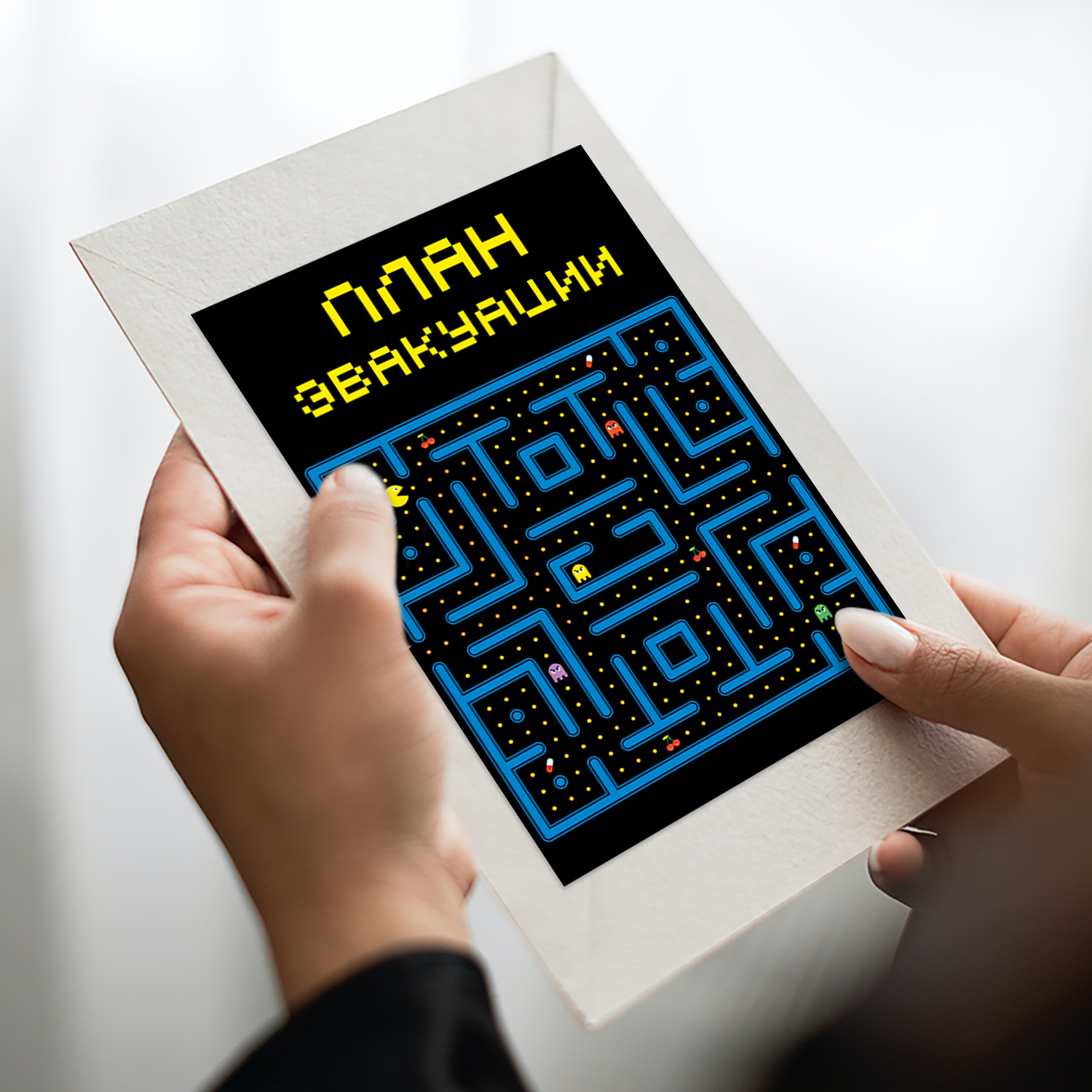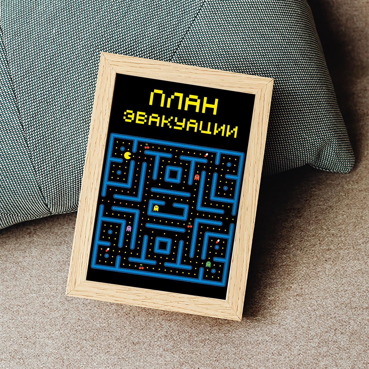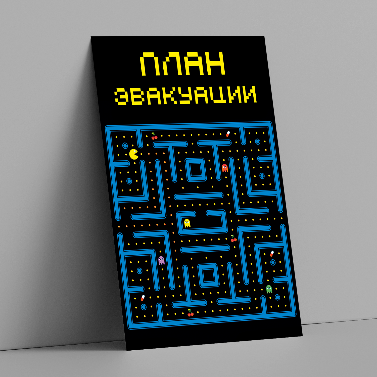 Купить Дизайнерская открытка "План эвакуации PacMan" (10х15см, плотная бумага, авторский креатив)