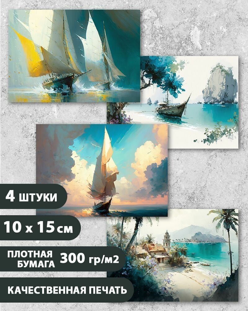 Набор открыток "Морская 3", Парусник, море, 10.5 см х 15 см, 4 шт, на подарок и в коллекцию